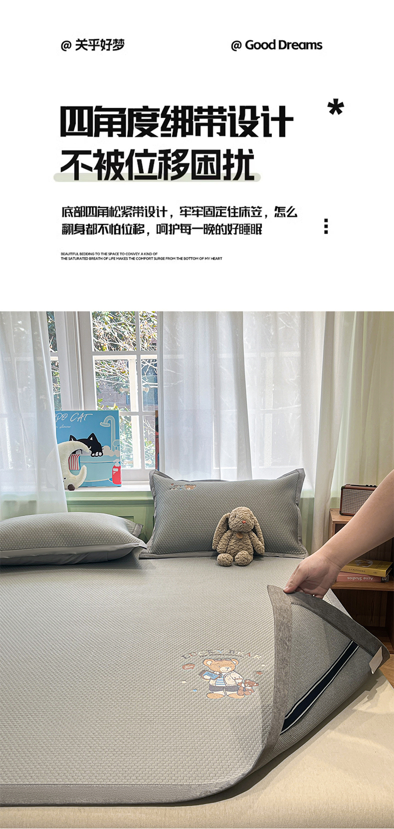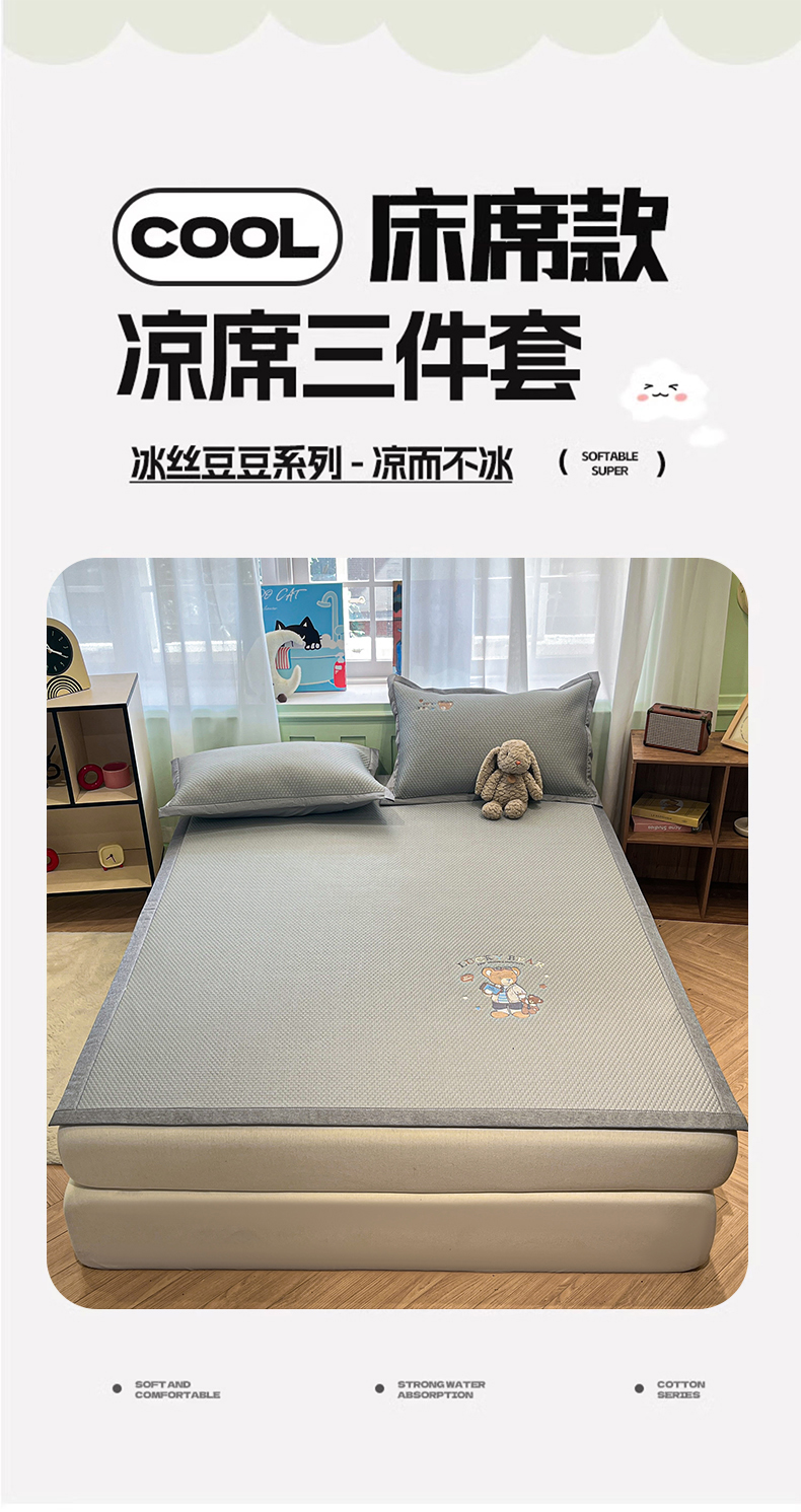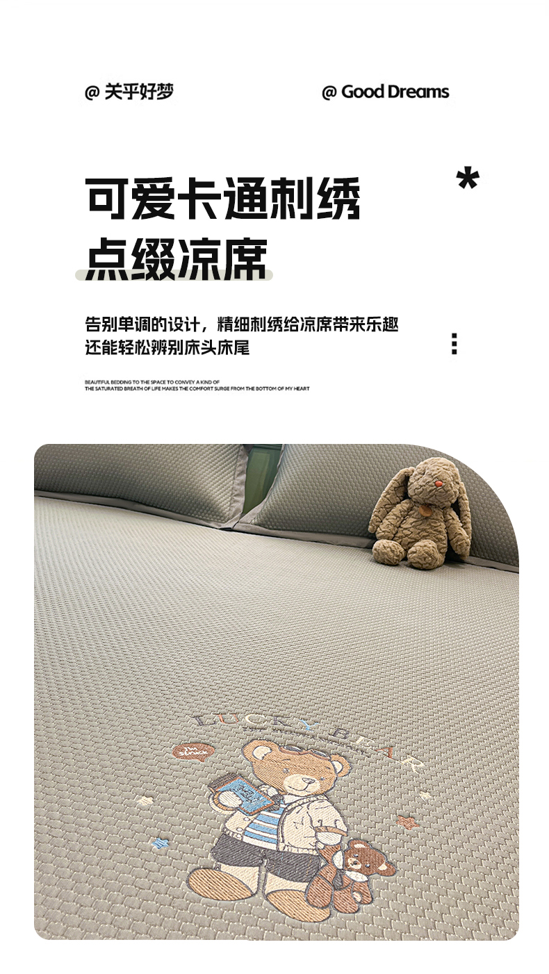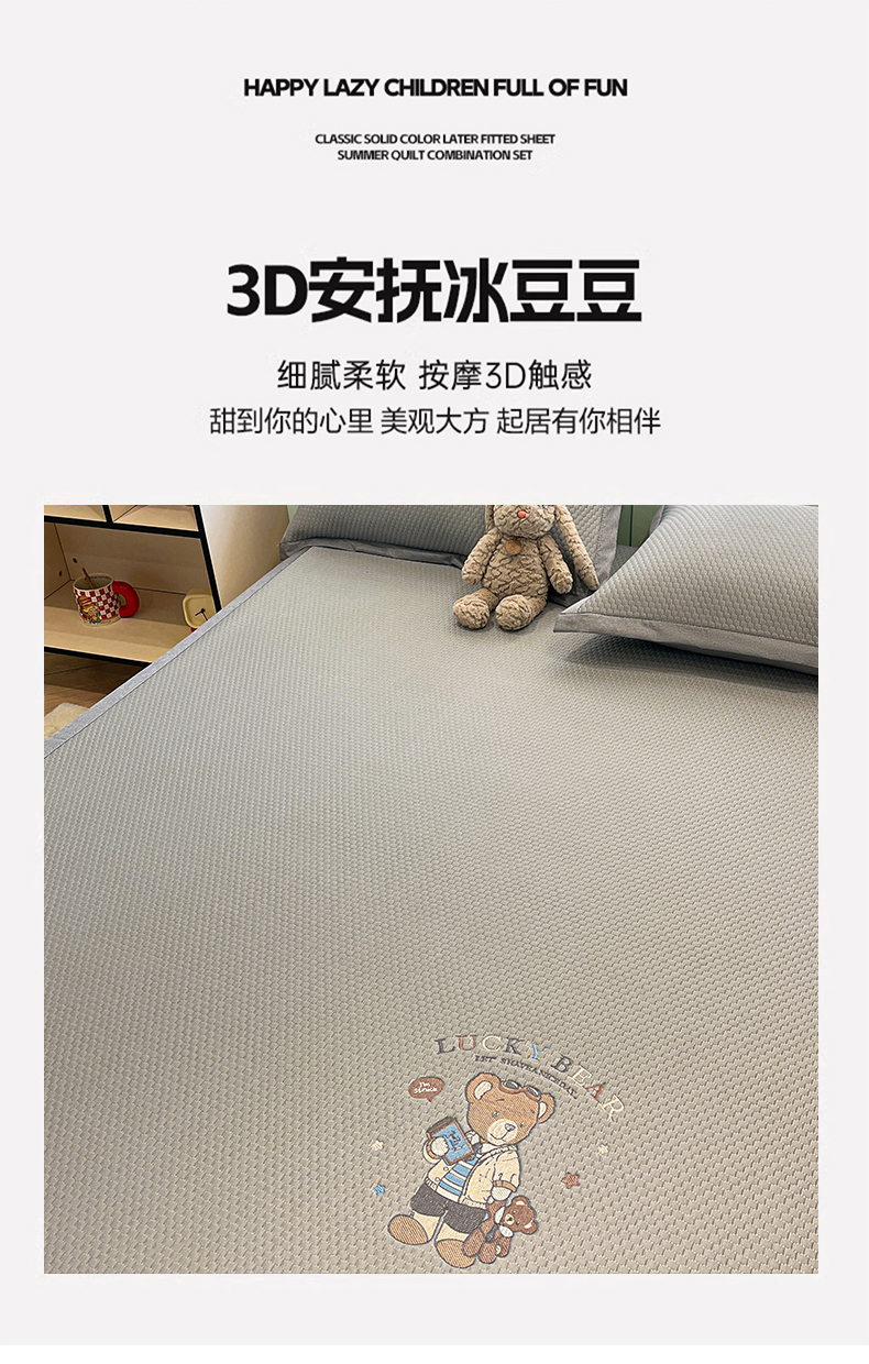 启程家纺 2025春夏新款冰豆豆凉席刺绣款复合三明治三件套 熊仔宝贝-灰