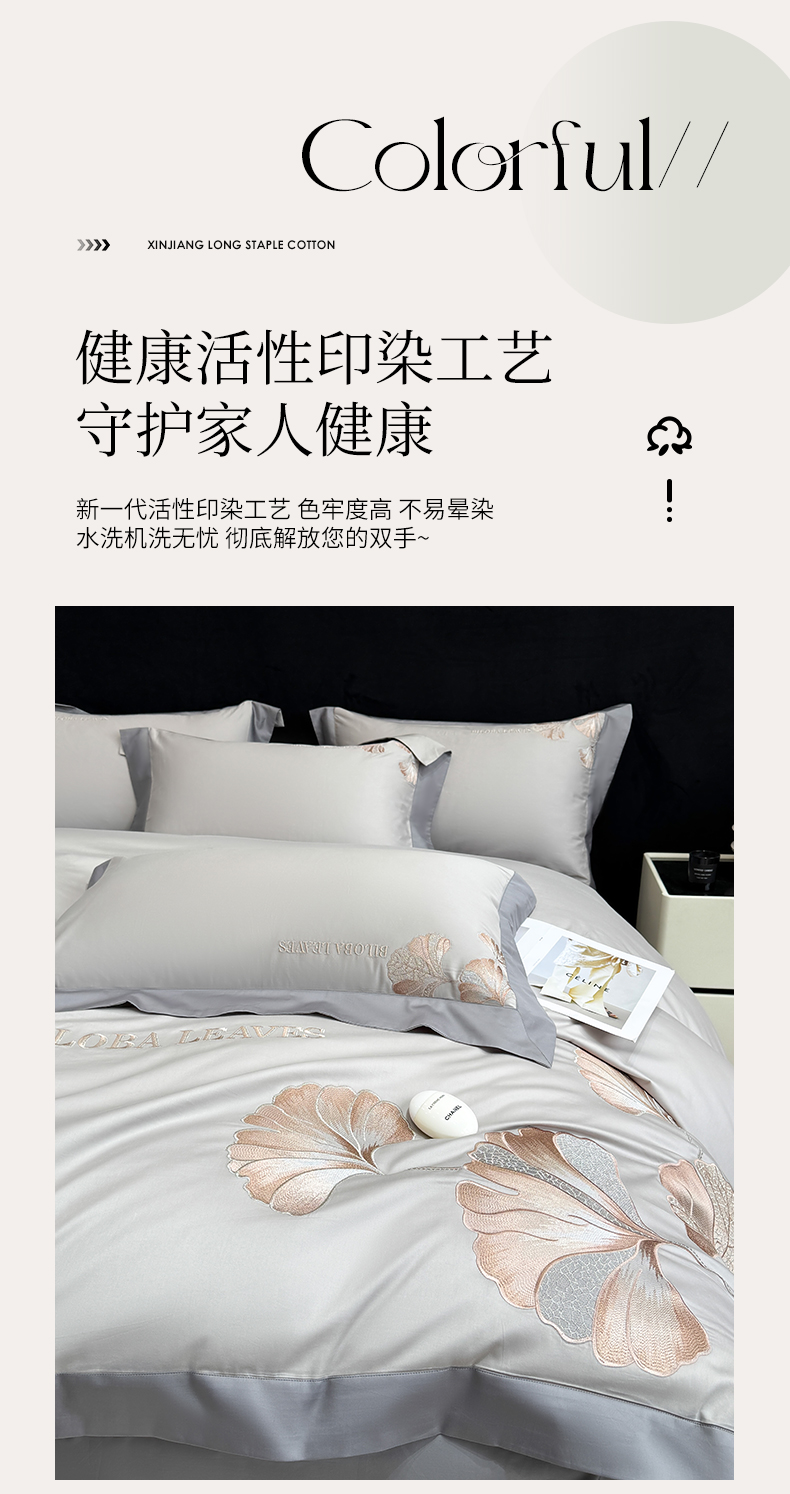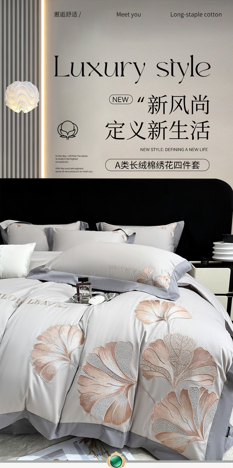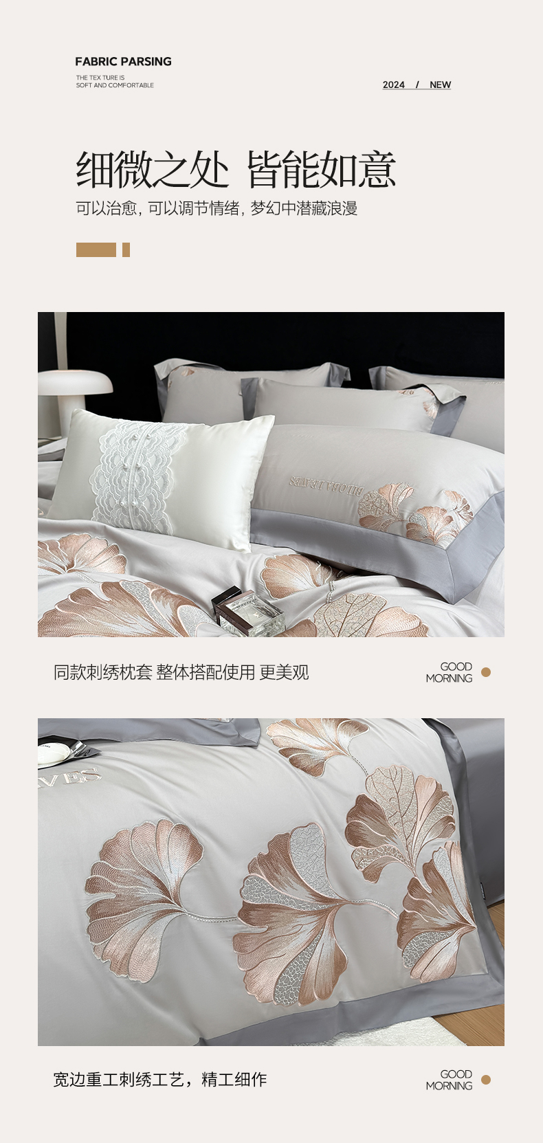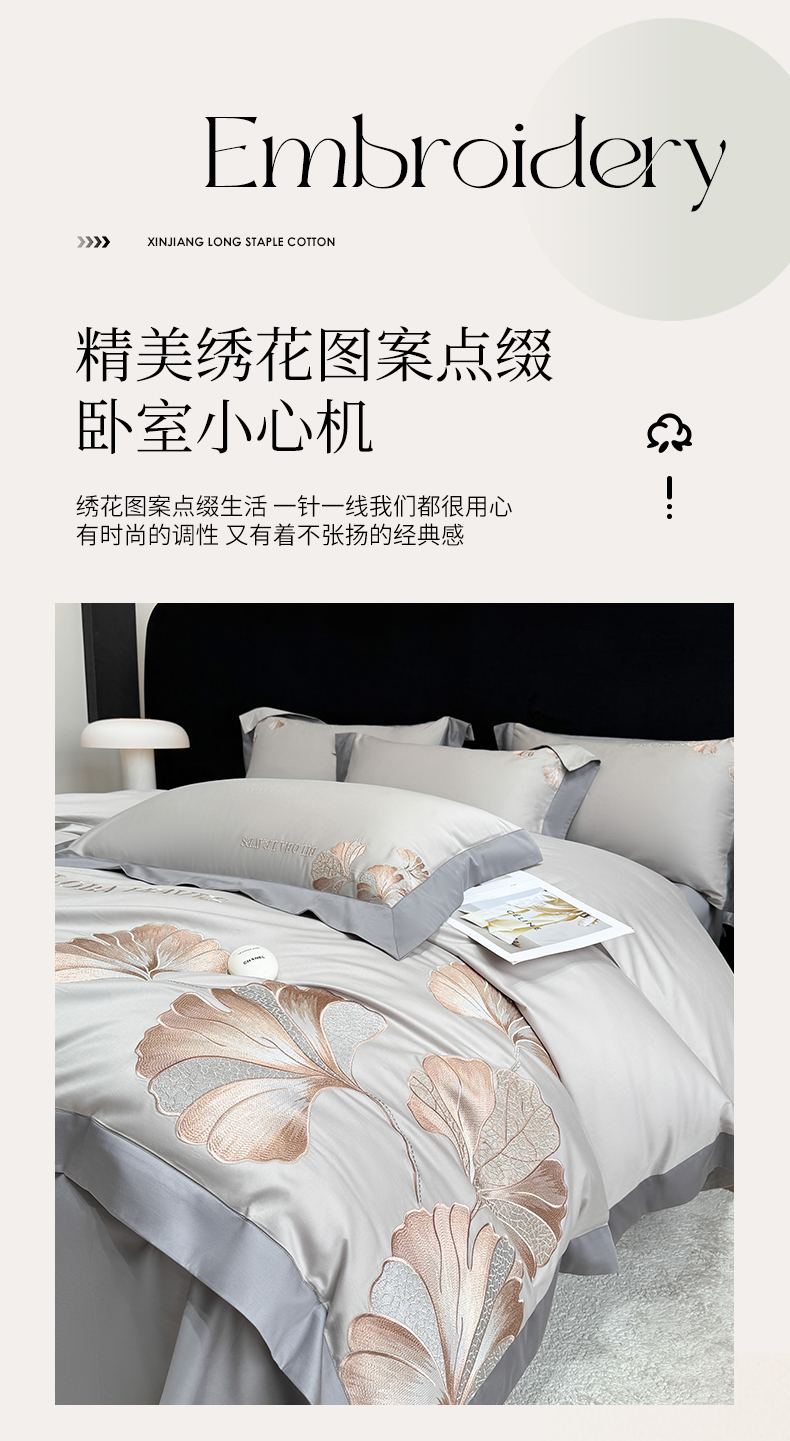 商品名称:家居1号 2025新款a类长绒棉绣花四件套 金色银杏-绅士灰