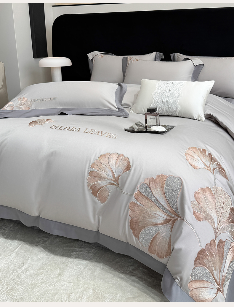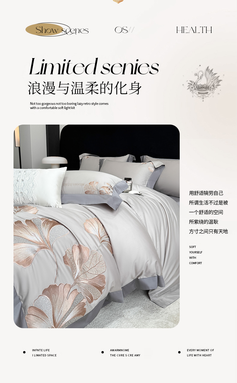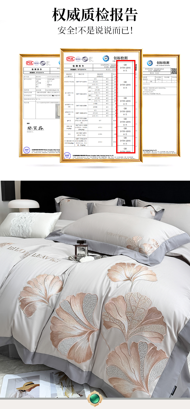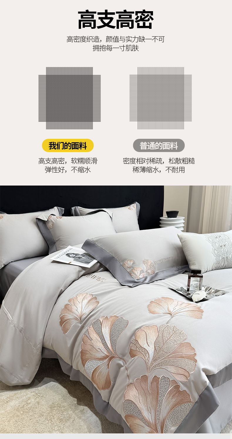 商品名称:家居1号 2025新款a类长绒棉绣花四件套 金色银杏-绅士灰
