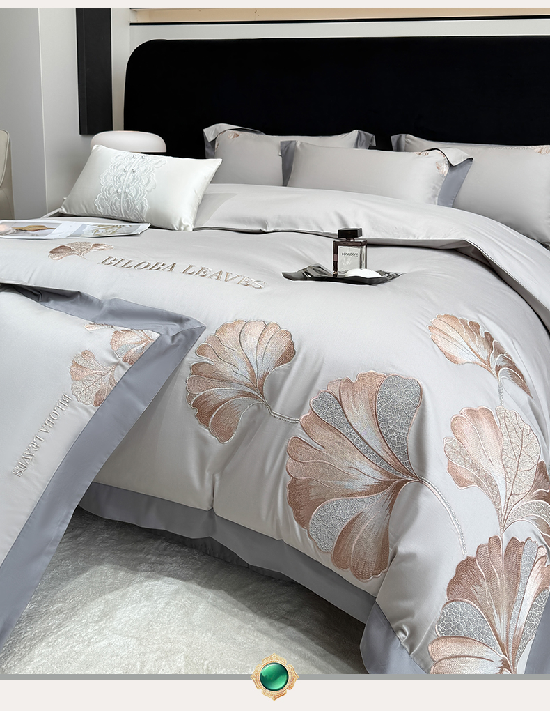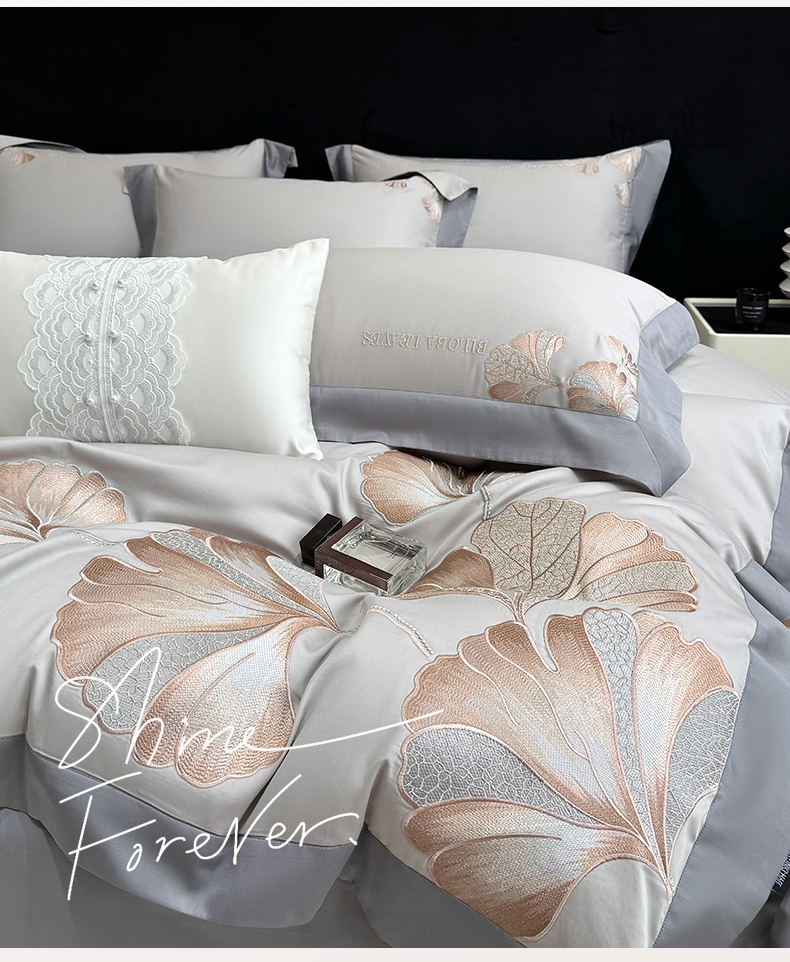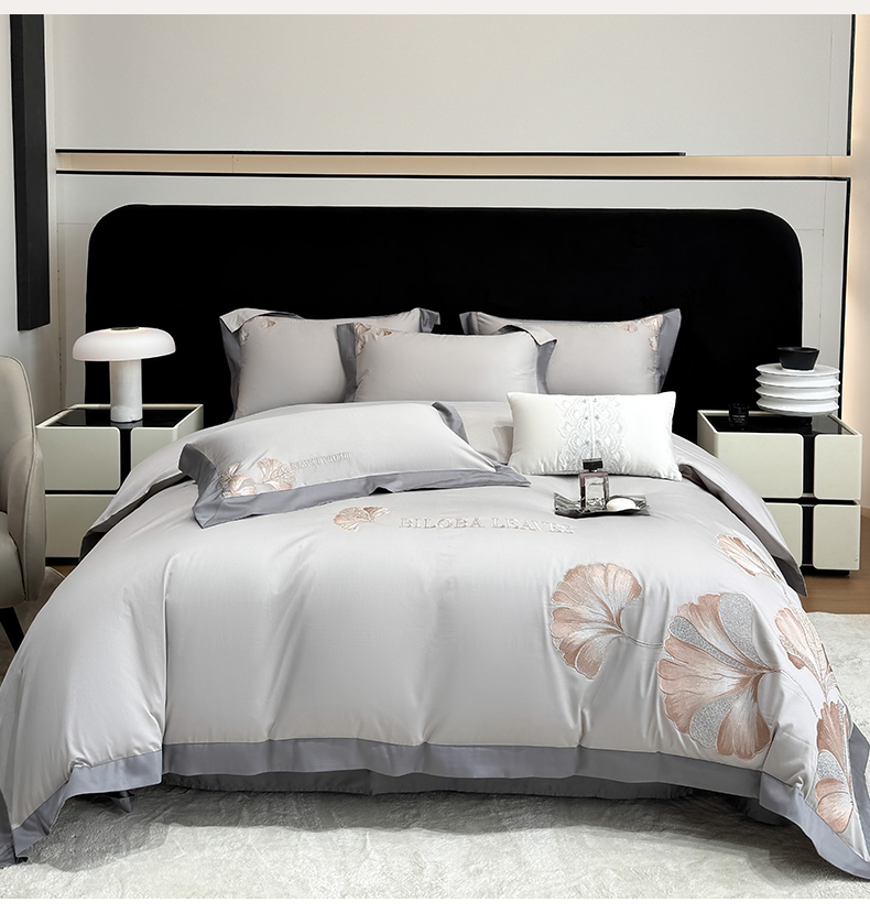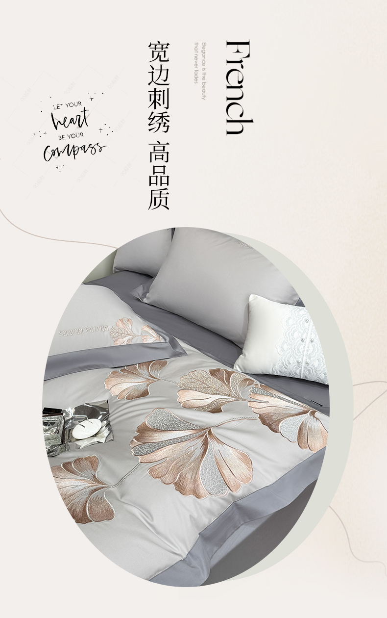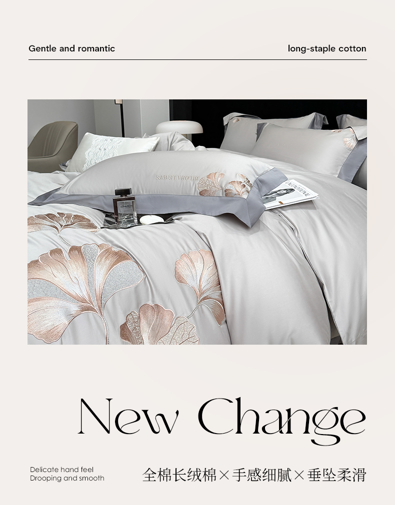商品名称:家居1号 2025新款a类长绒棉绣花四件套 金色银杏-绅士灰