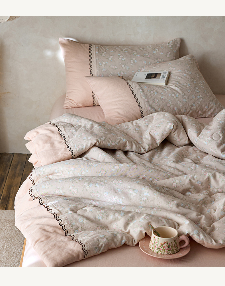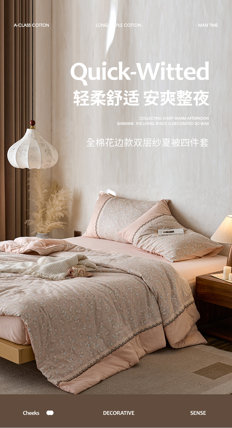安莱生活 2025新款全棉纯棉双层纱复古花边款夏被夏凉被空调被四件套 暖阳