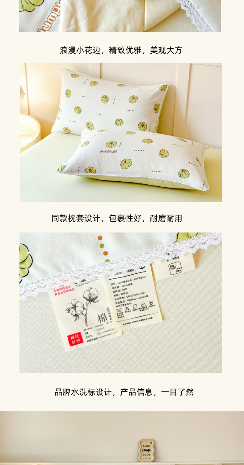 当前位置: 91家纺网 > 商品网购 > 被子 > 夏被 > 仁凯家纺 2025新款A类针织棉双层纱100%新疆棉花花边夏凉被四件套(包检测)(提供买家秀) 倾心南瓜
