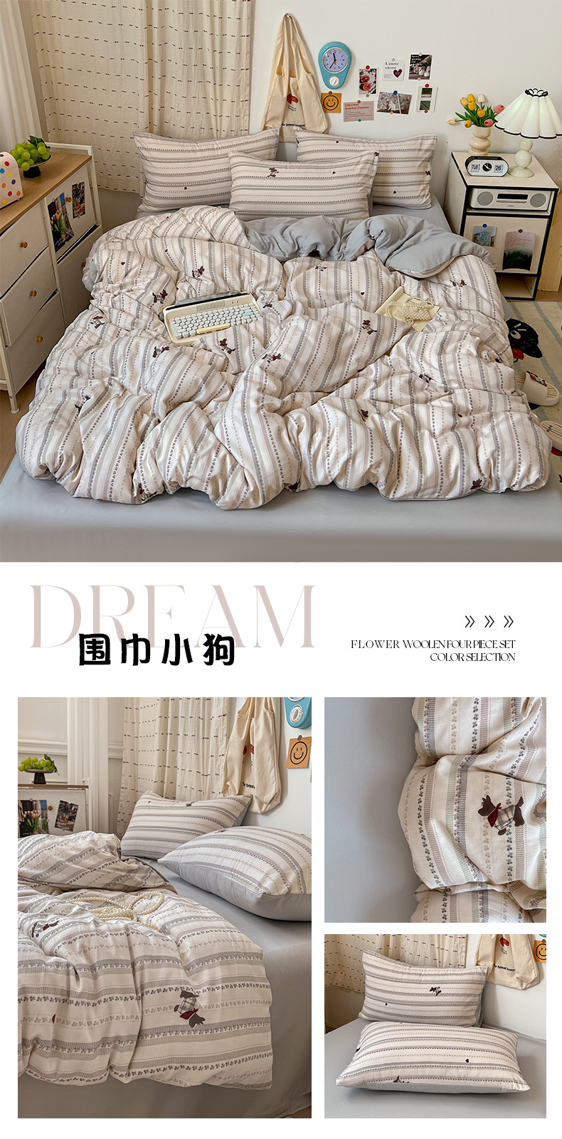 当前位置: 91家纺网 > 商品网购 > 床品套件 > 四件套 > 其它四件套 > 源莱 2025开学季小清新卡通时尚印花水洗双层纱四件套 围巾小狗