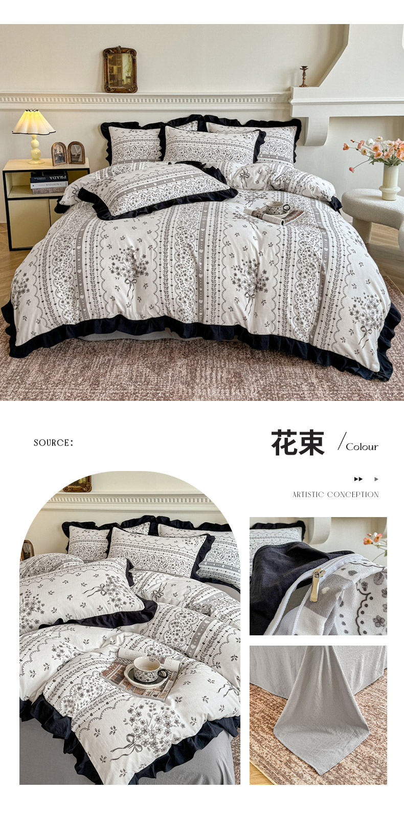 当前位置: 91家纺网 > 商品网购 > 床品套件 > 四件套 > 双层纱四件套 > 芷凡家纺 2025新款水洗棉双层纱赫本风四件套-风格二 花束