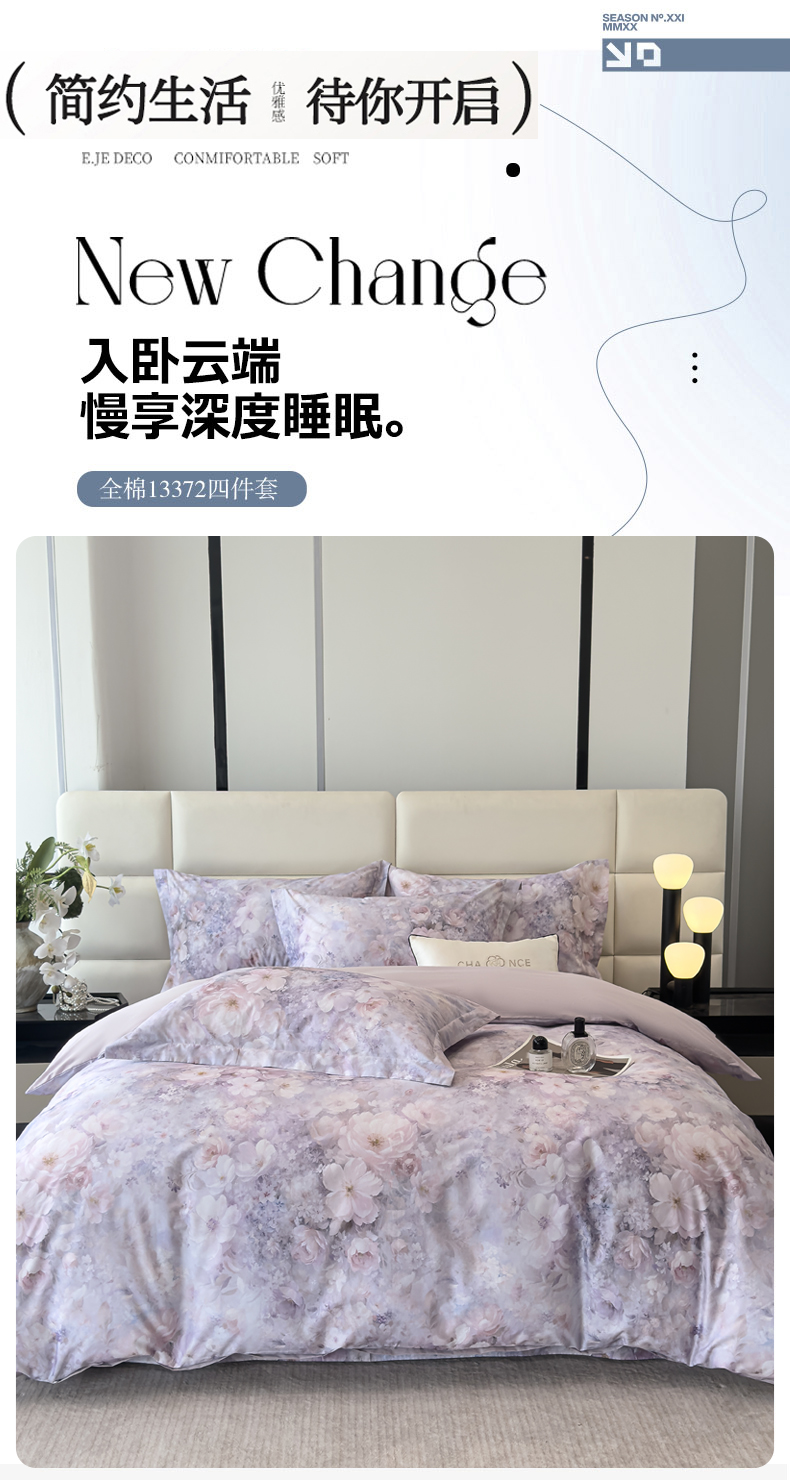 洺兰家居 2025新款高支高密轻奢数码印花四件套长绒棉纯棉四件套 枝瑾-紫