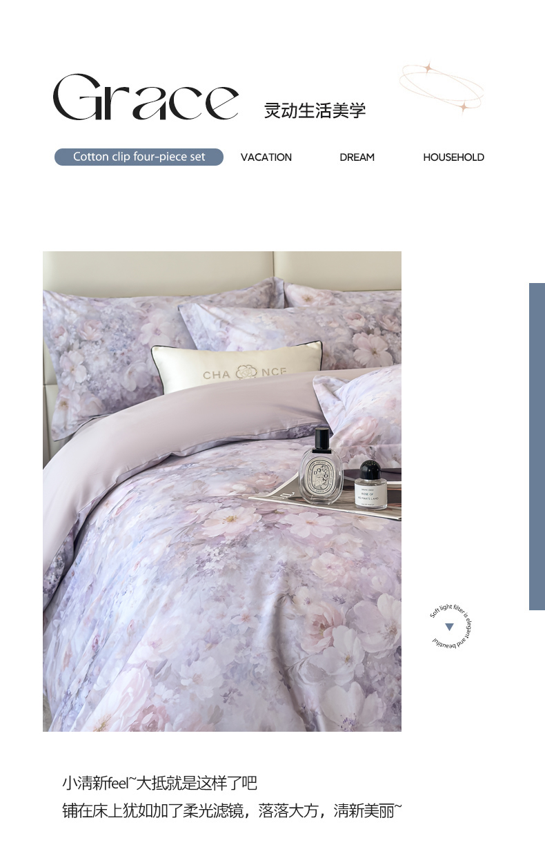 (总)洺兰家居 2026年新疆长绒棉100支天丝棉高端工艺款床单床笠四件套床上用品,淡若清香,陌上花开,羽墨