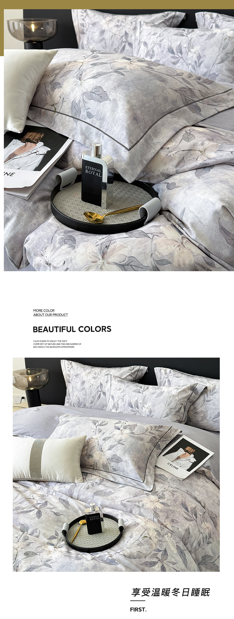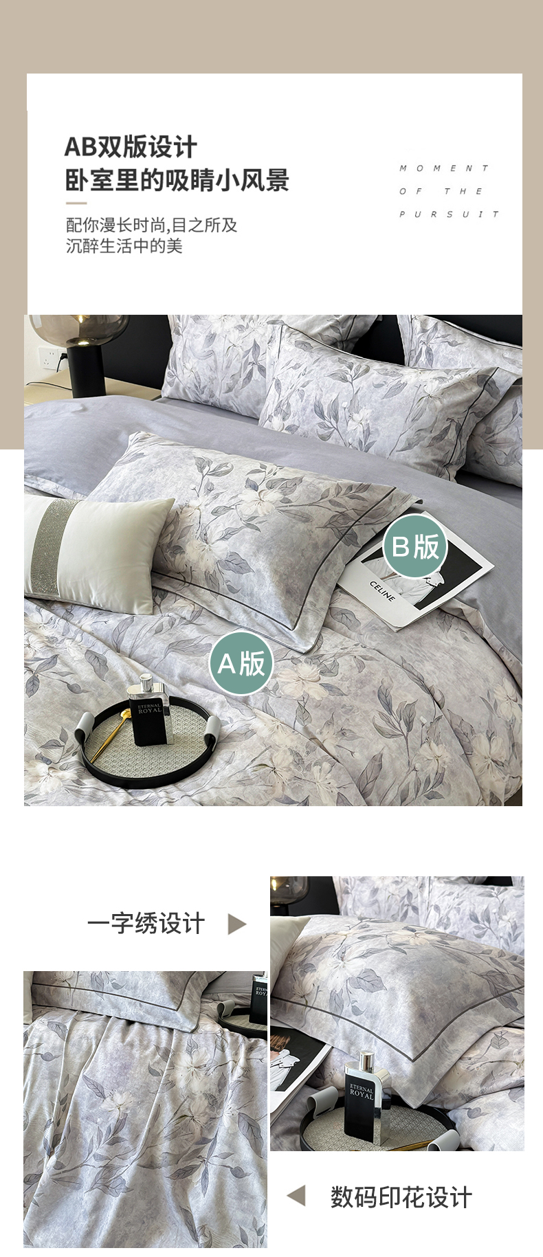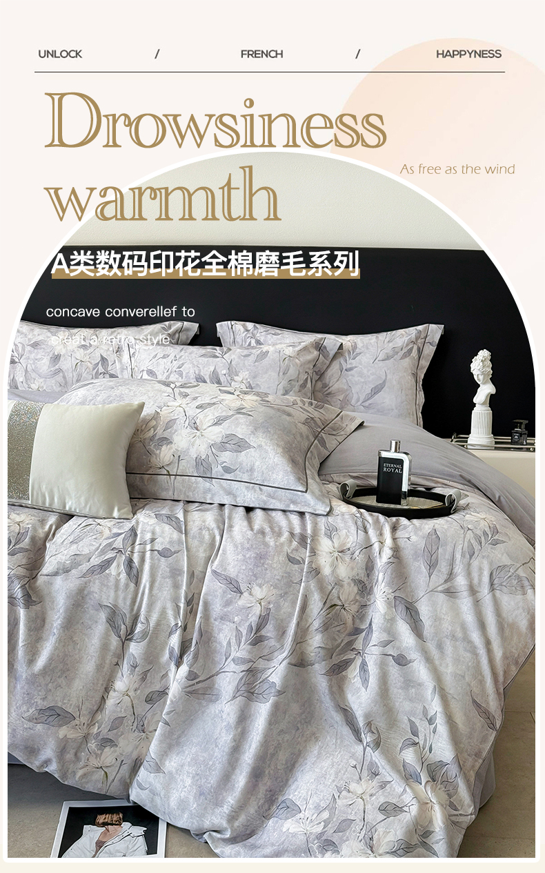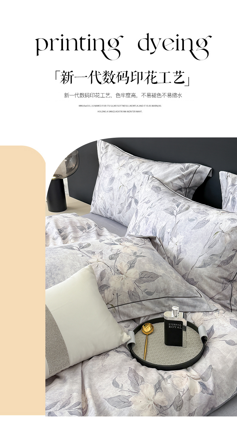当前位置: 91家纺网 > 商品网购 > 床品套件 > 四件套 > 普通磨毛四件套 > 清雅福2025新款A类全棉磨毛数码印花四件套 琼枝·灰
