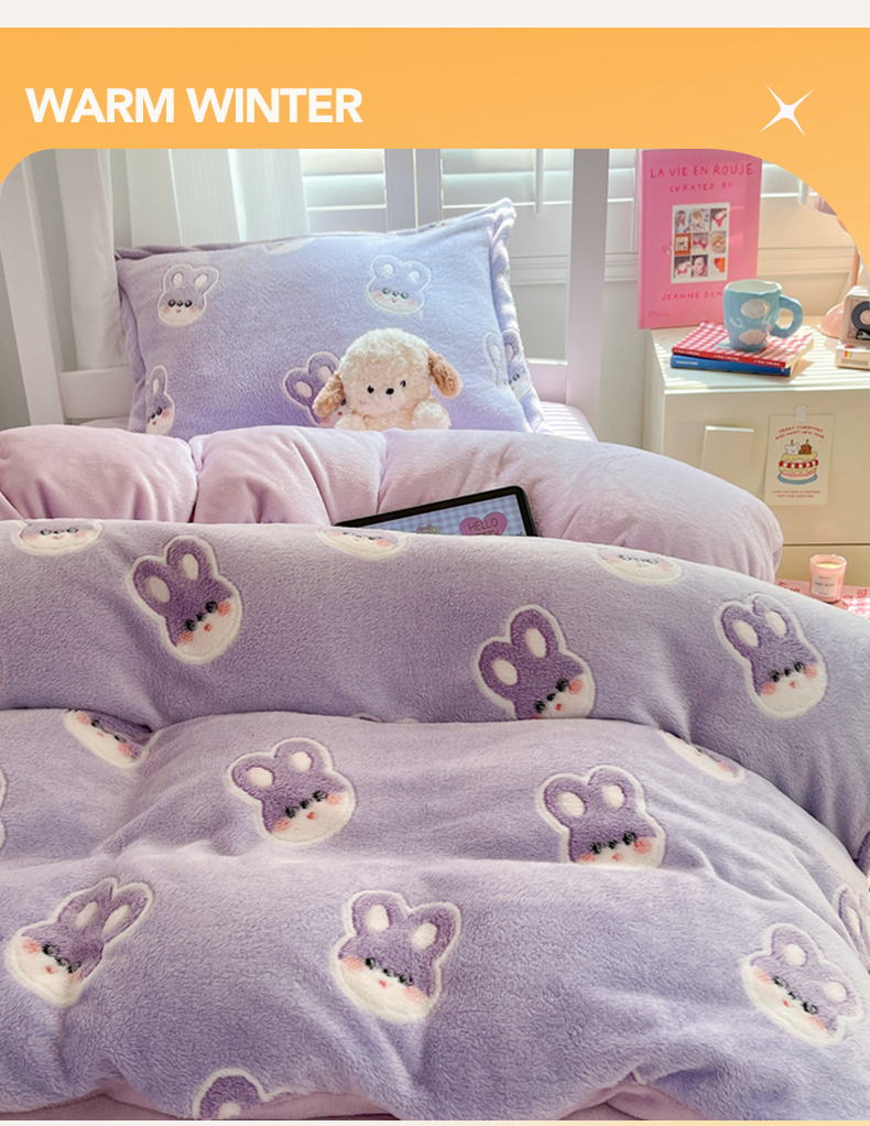 当前位置: 91家纺网 > 商品网购 > 床品套件 > 四件套 > 法莱绒四件套 > 川悦生活 2025新款立体雪花绒印花四件套学生床系列一场景二 妮娜兔