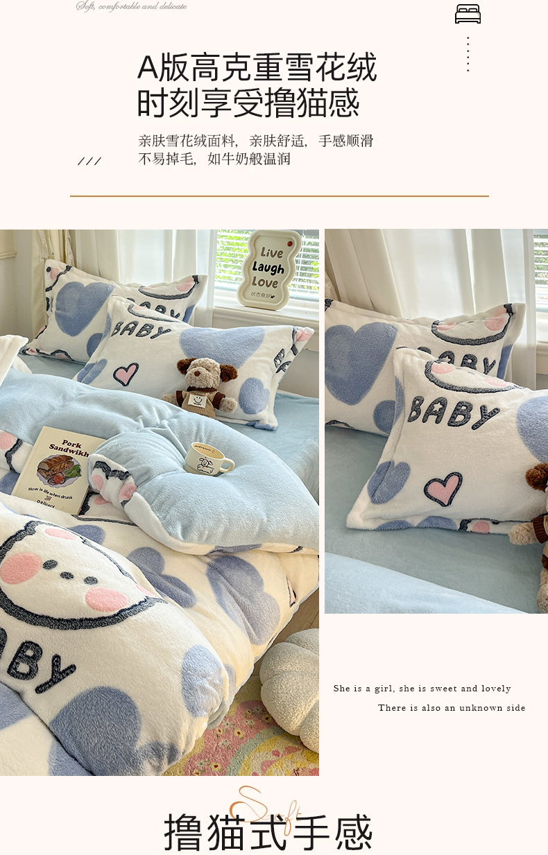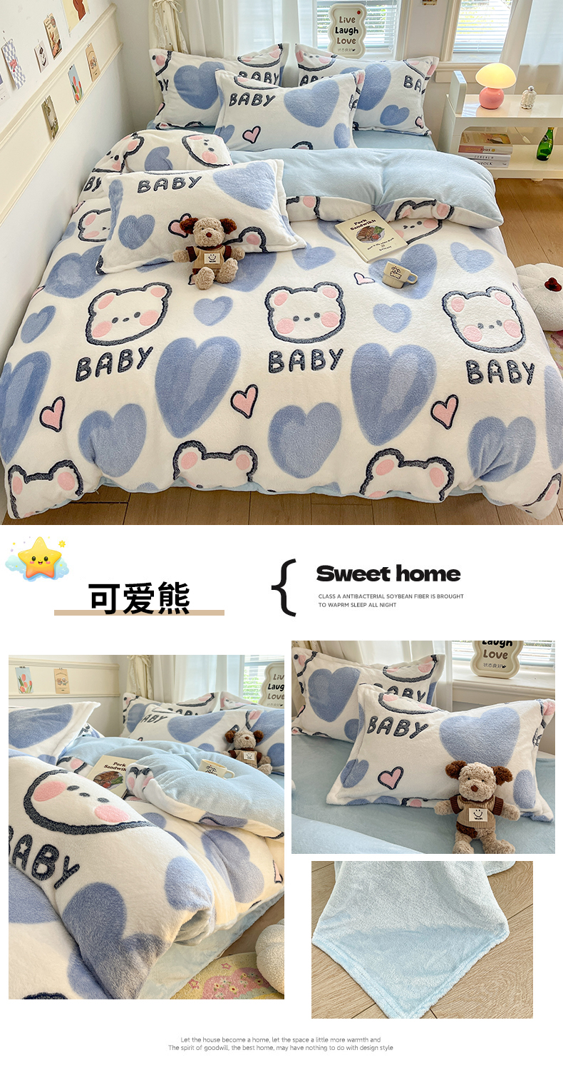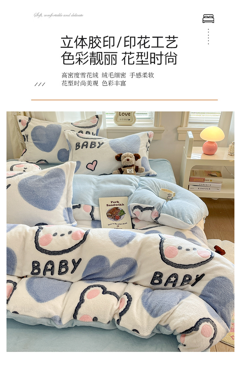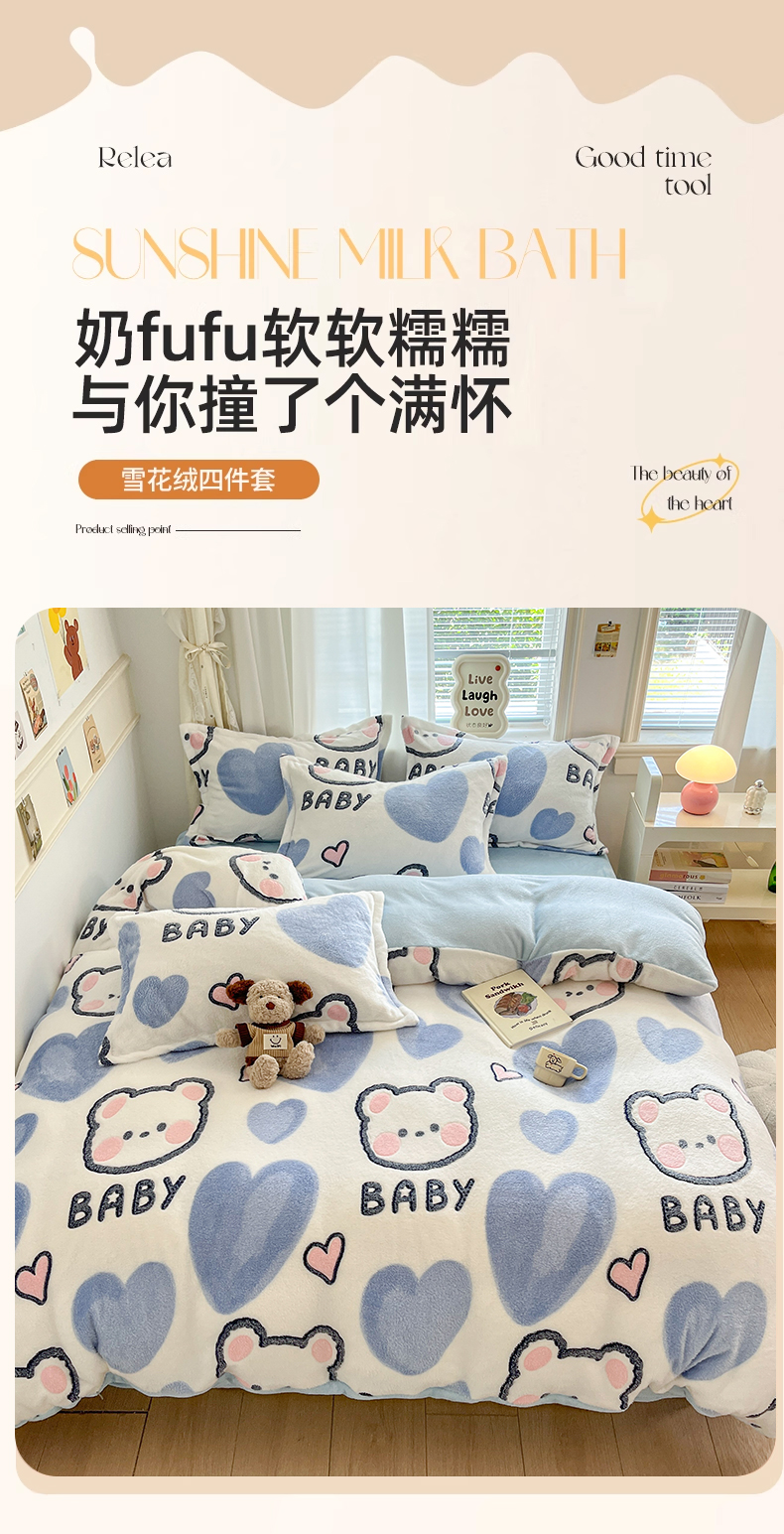 当前位置: 91家纺网 > 商品网购 > 床品套件 > 四件套 > 法莱绒四件套 > 川悦生活 2025新款立体雪花绒印花大床四件套系列一场景二 可爱熊