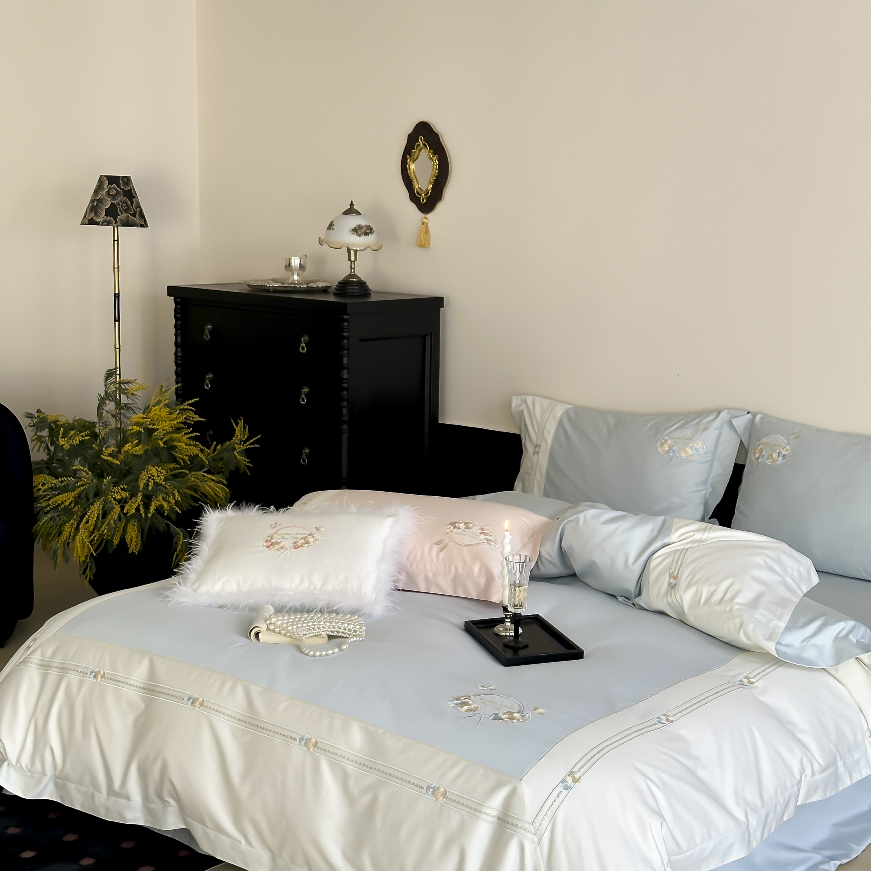 (总)初拾 2025新款100s双股澳棉刺绣四件套-赫拉公主(棉),棉 赫拉公主-海边蓝,棉 赫拉公主-奶油粉
