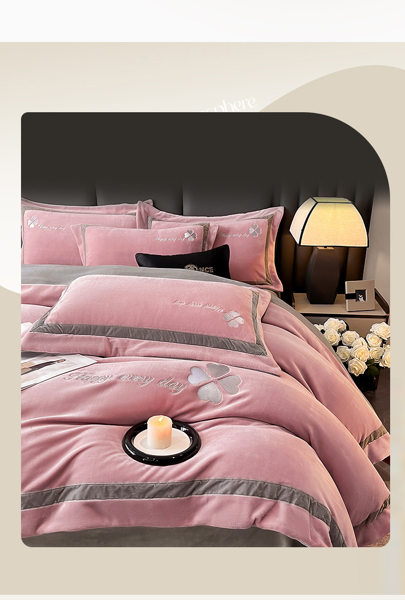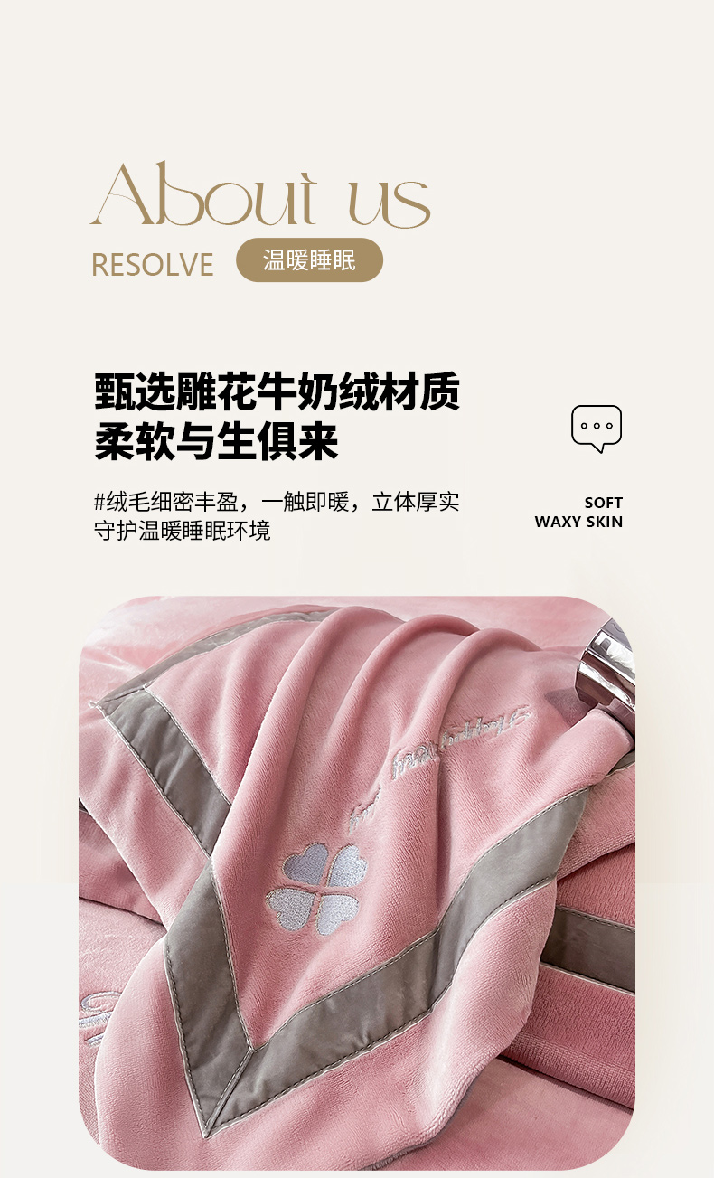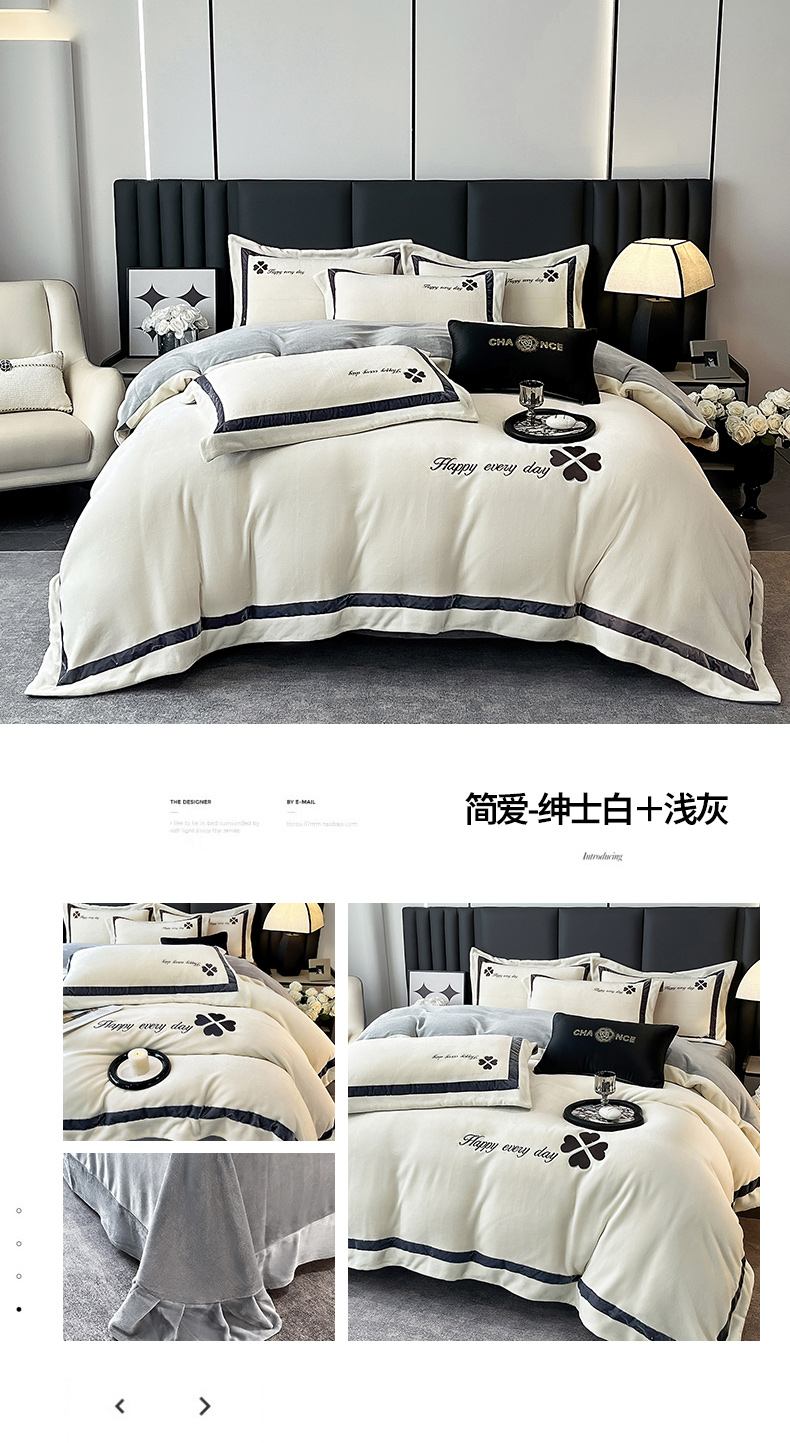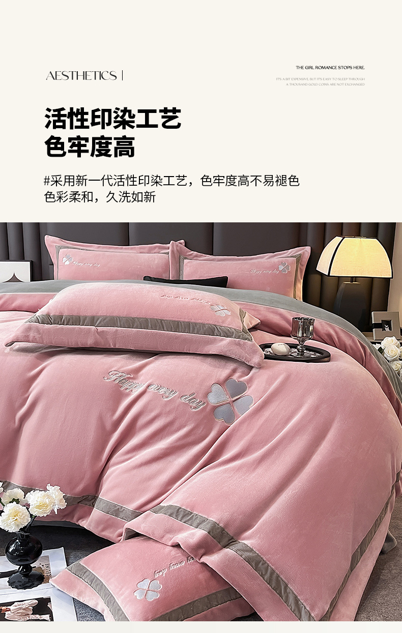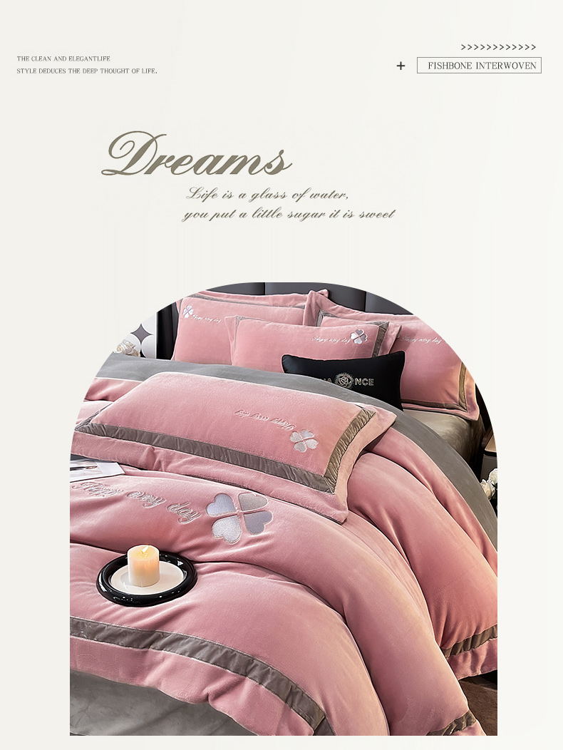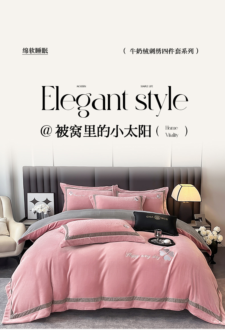 当前位置: 91家纺网 > 商品网购 > 床品套件 > 四件套 > 牛奶绒四件套 > 妮恒美家纺 2025新款牛奶绒刺绣四件套-简爱系列 简爱-豆沙+浅灰