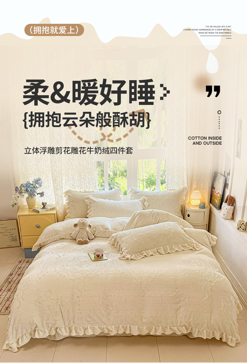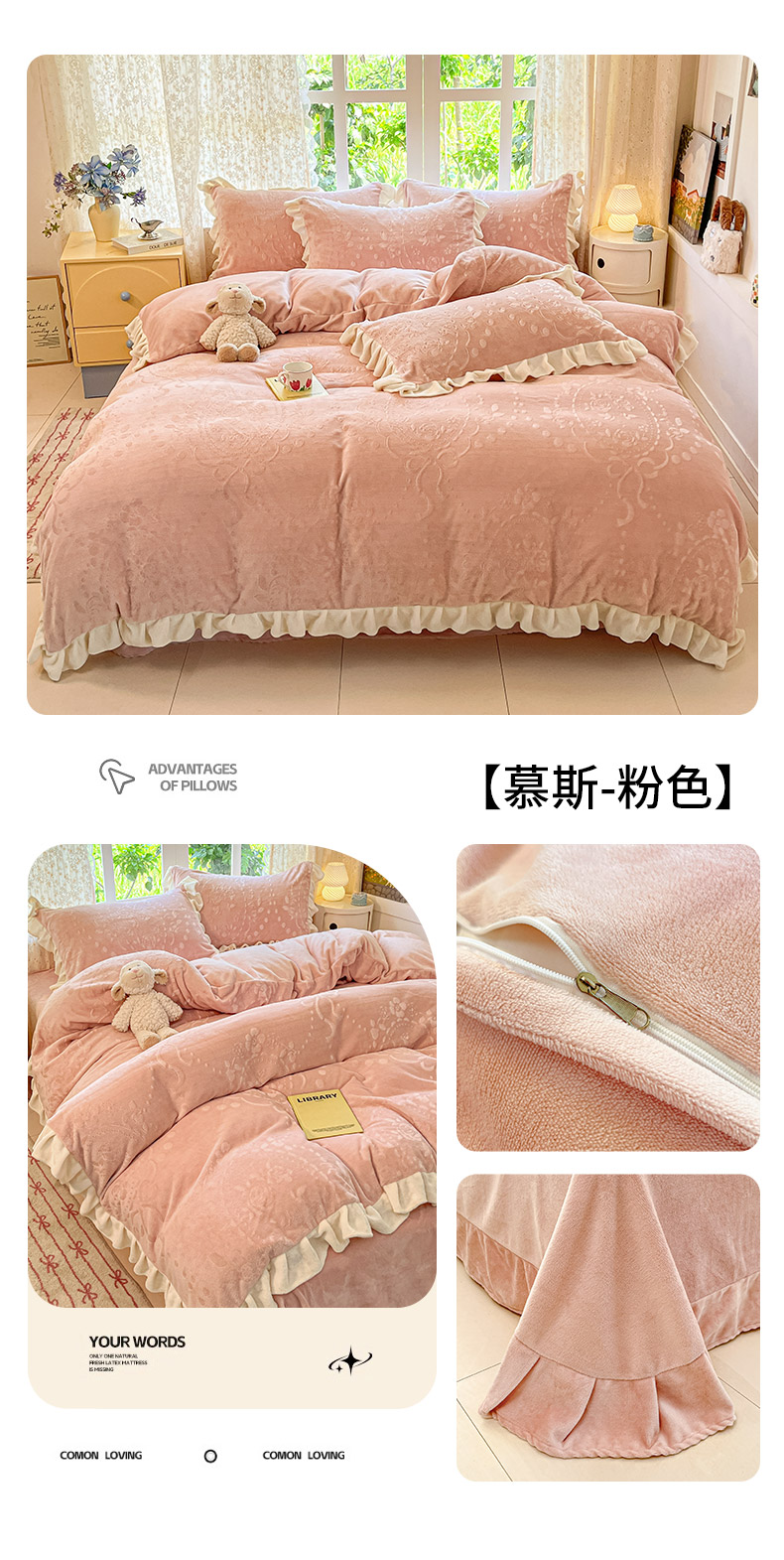 (总)金阳光家纺 2024新款立体雕花牛奶绒四件套,豆沙色,灰色,奶茶棕,浅蓝色,浅绿色,浅驼色,浅玉色,浅紫色