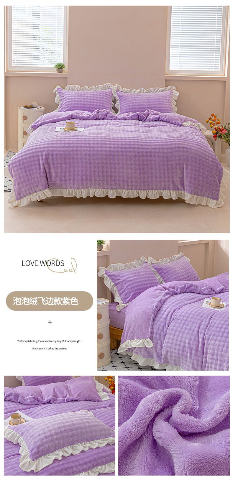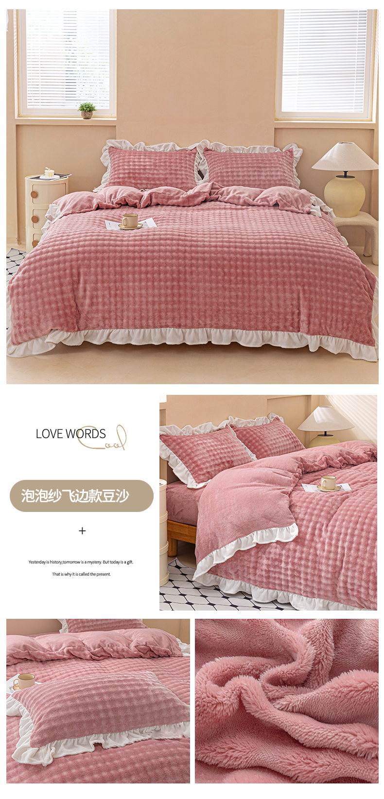当前位置: 91家纺网 > 商品网购 > 床品套件 > 四件套 > 牛奶绒四件套 > 恩和家纺 2025新款泡泡牛奶绒荷叶边款四件套 泡泡绒飞边款豆沙