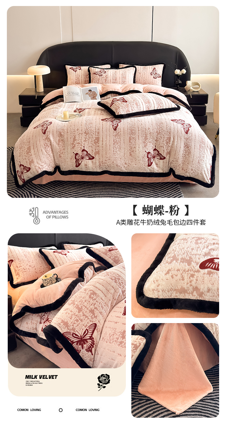 商品名称:卡罗兰 2025新款雕花牛奶绒兔毛包边四件套 蝴蝶-粉红