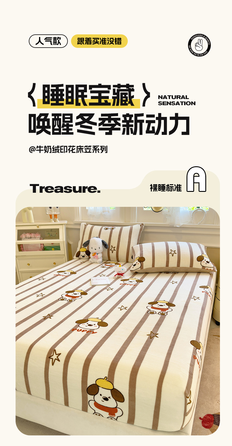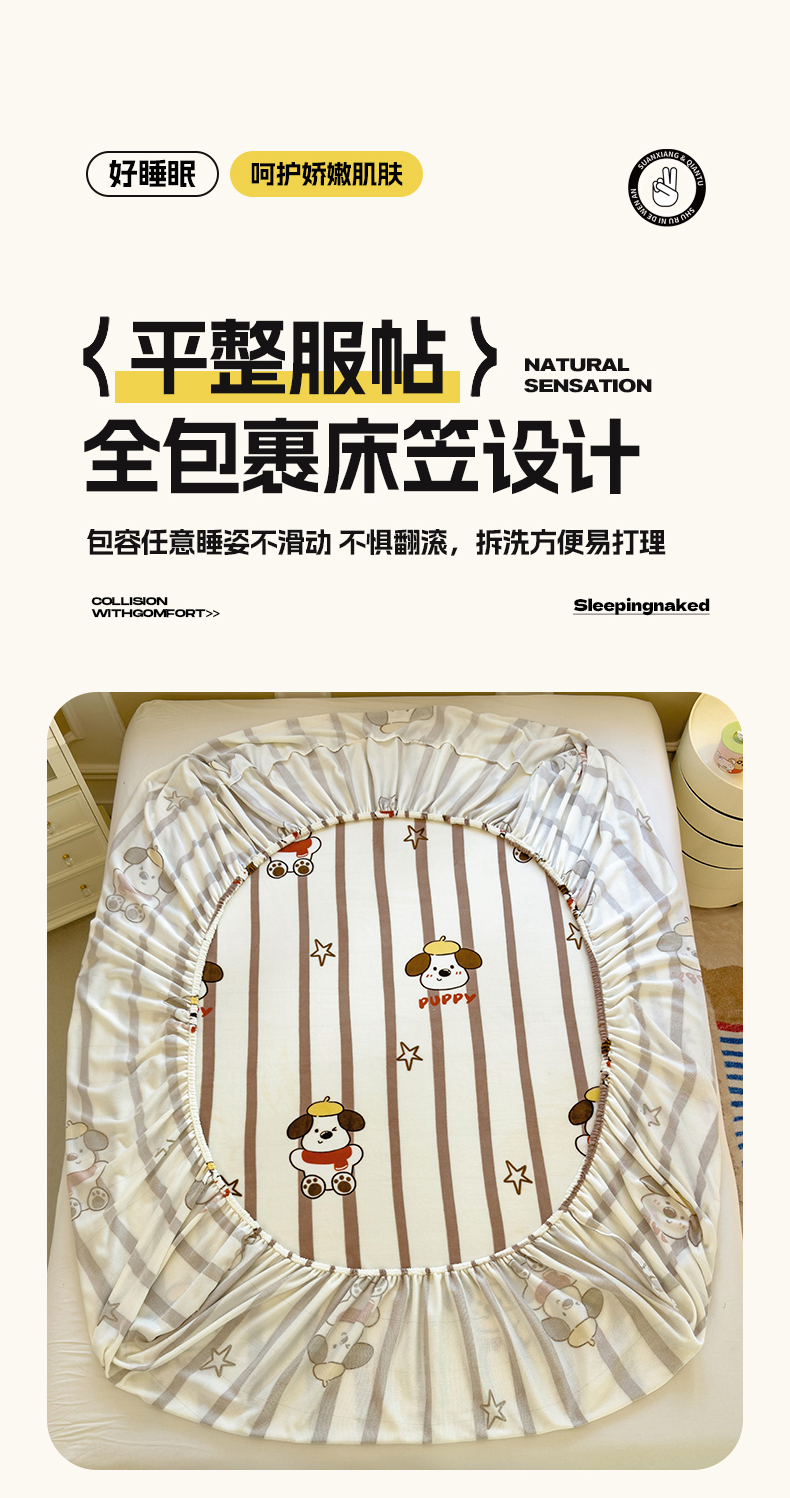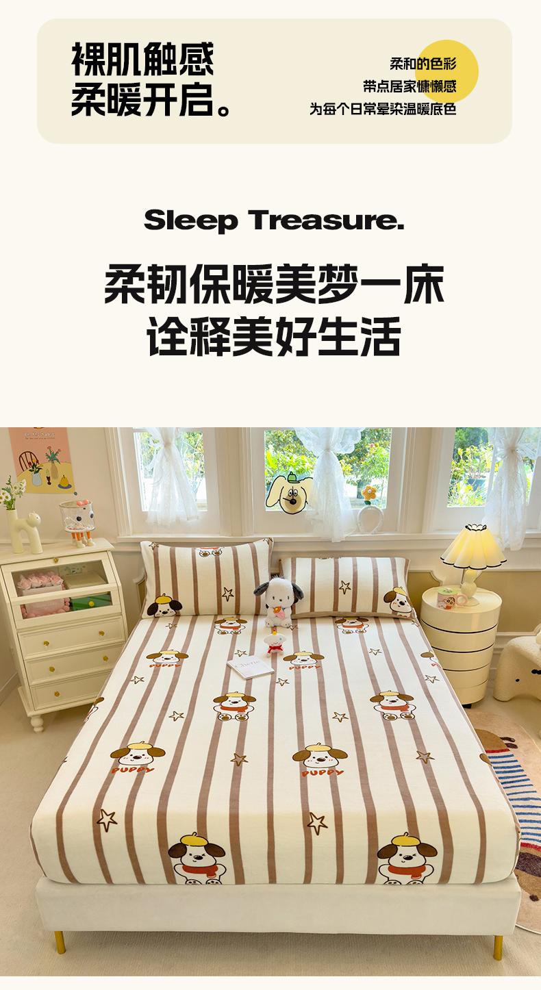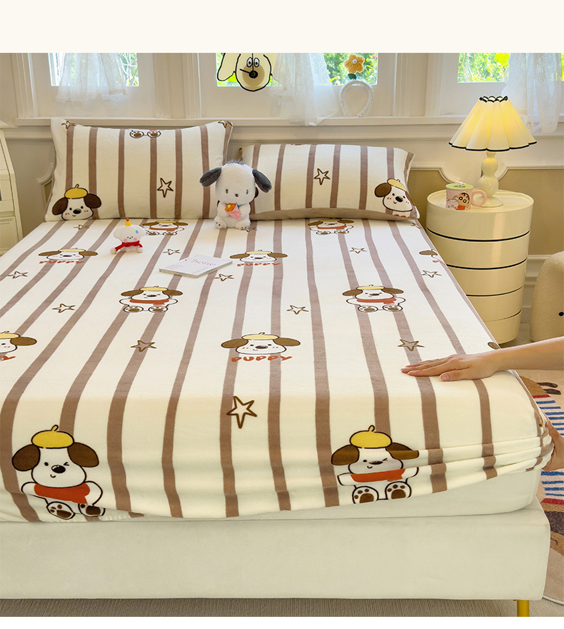 • 91家纺网 家纺一手货源 找家纺 摩妮卡 2025新款印花系列小清新牛奶绒印花床笠三件套 嘟嘟狗