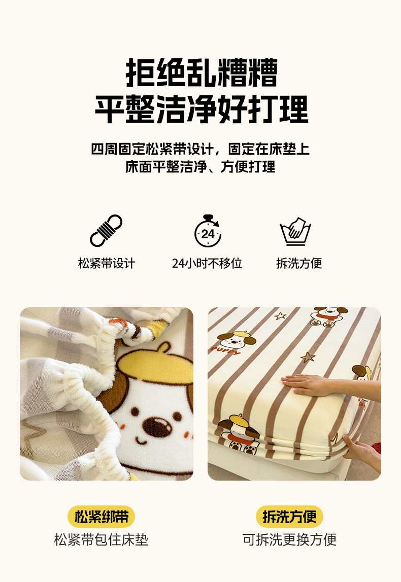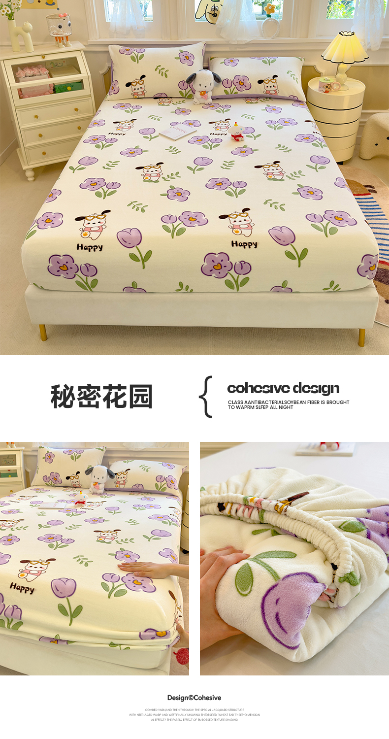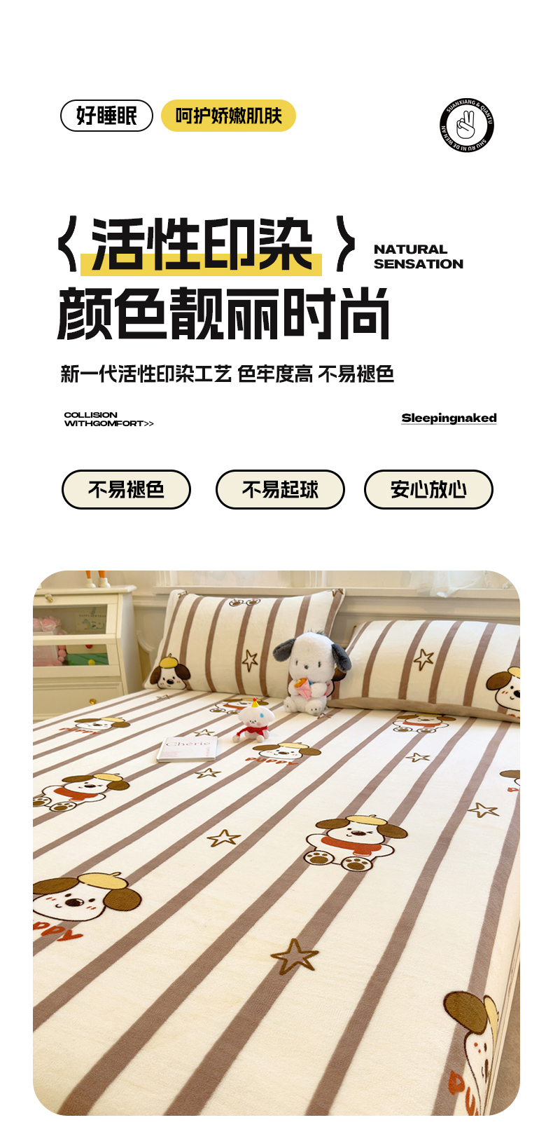 • 91家纺网 家纺一手货源 找家纺 摩妮卡 2025新款印花系列小清新牛奶绒印花床笠三件套 嘟嘟狗