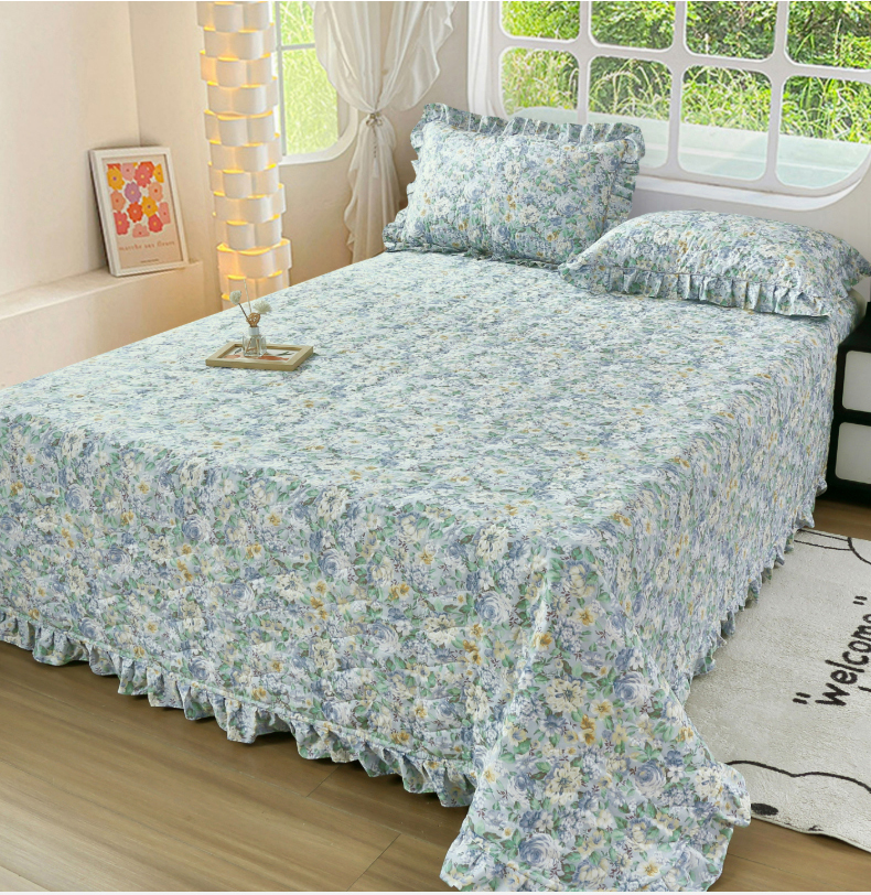 益利多 2025新款130*70全棉斜纹夹棉绗缝小花边床盖纯棉加厚床盖三件套 清风佳人