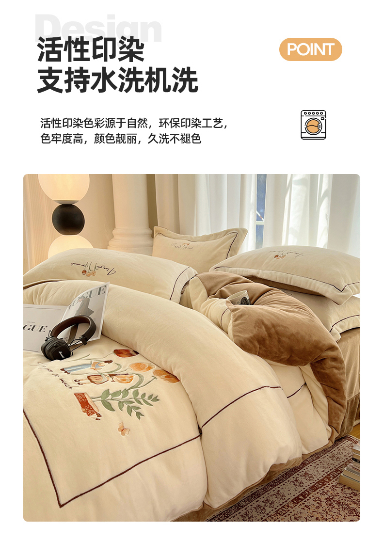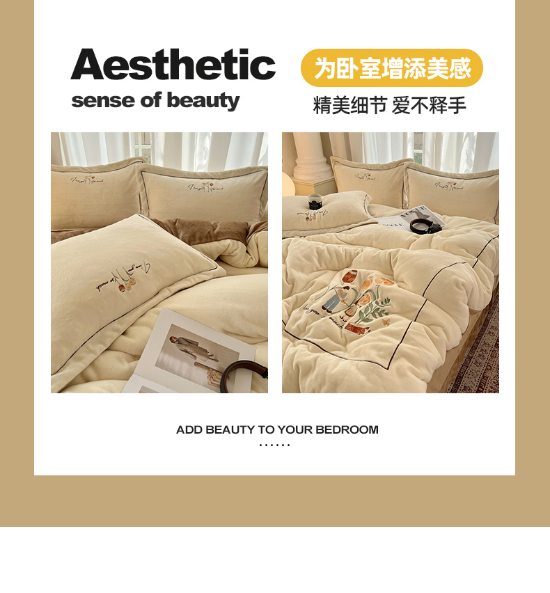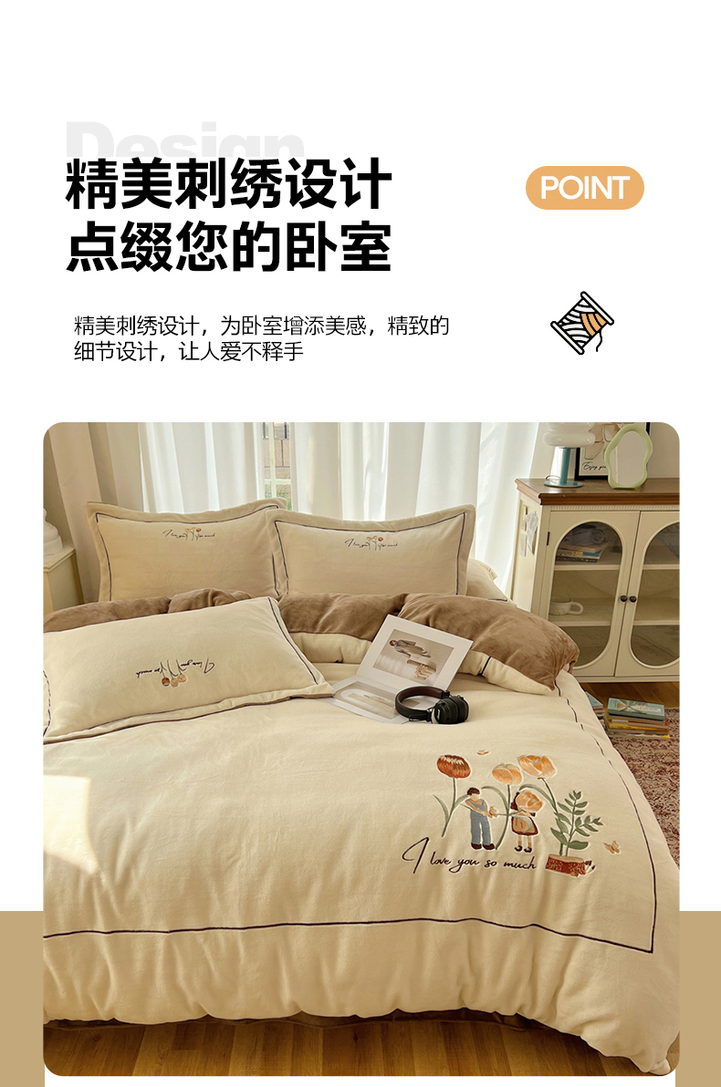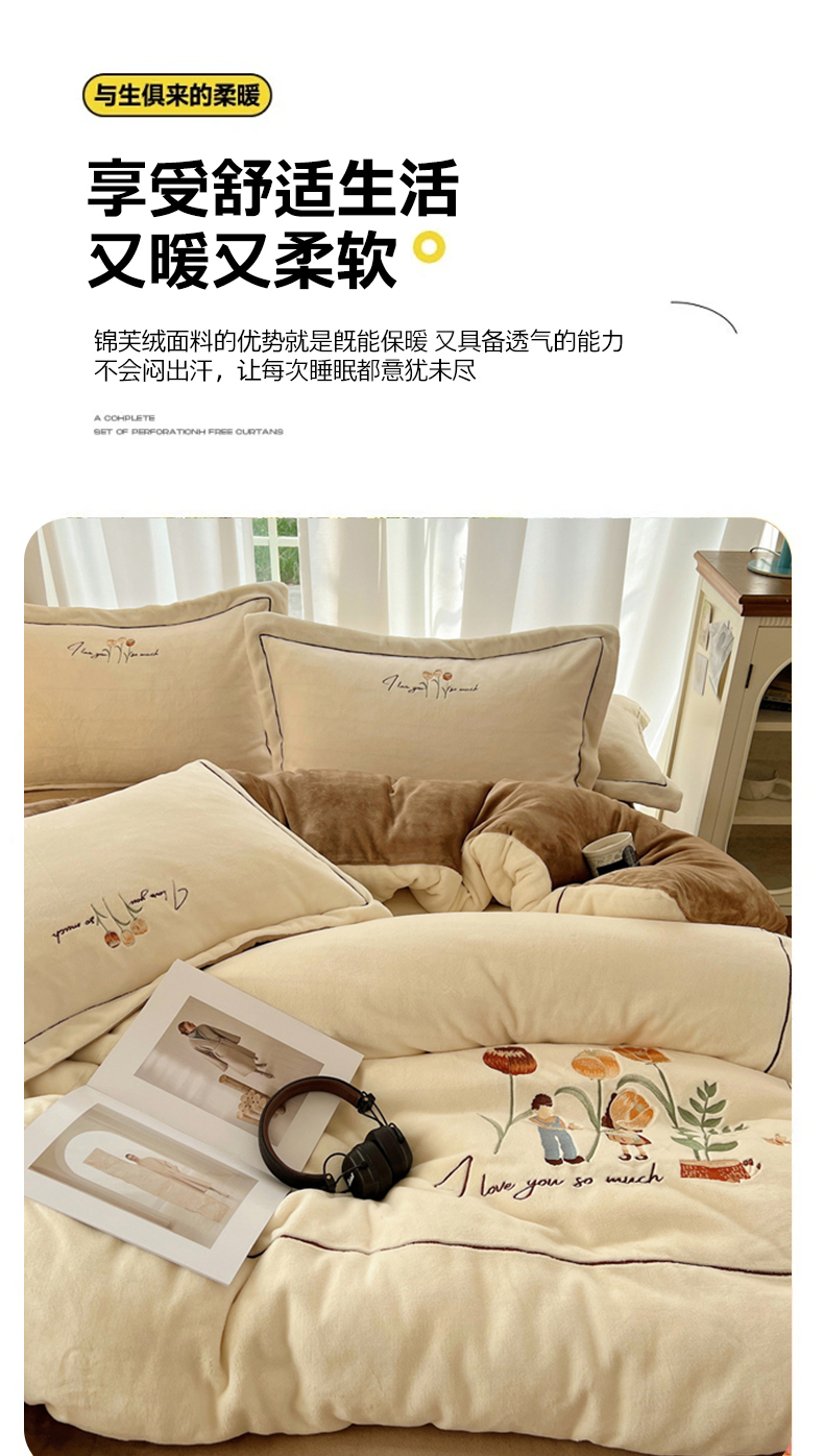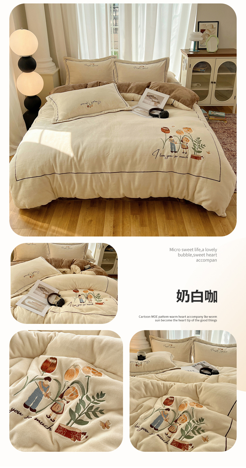 商品名称:丽涵家纺 2025新款全工艺消光锦芙绒绣花四件套 奶白咖