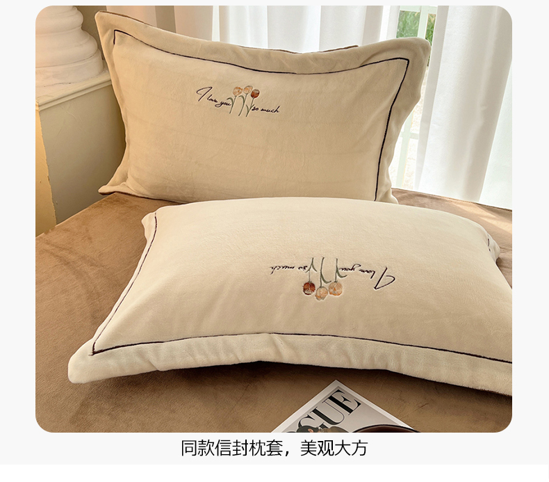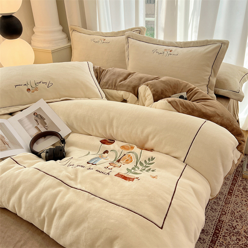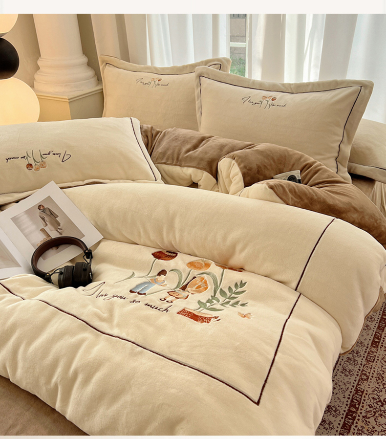 丽涵家纺 2025新款全工艺消光锦芙绒绣花四件套 奶白咖