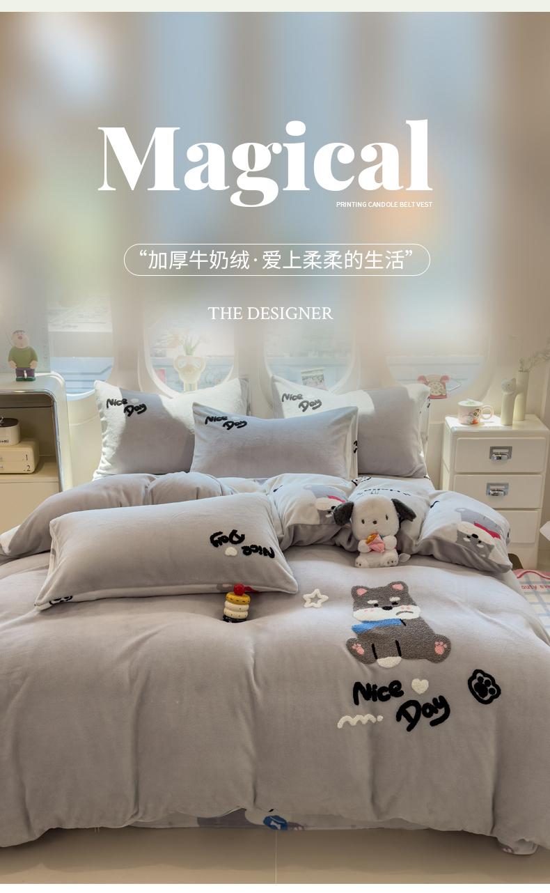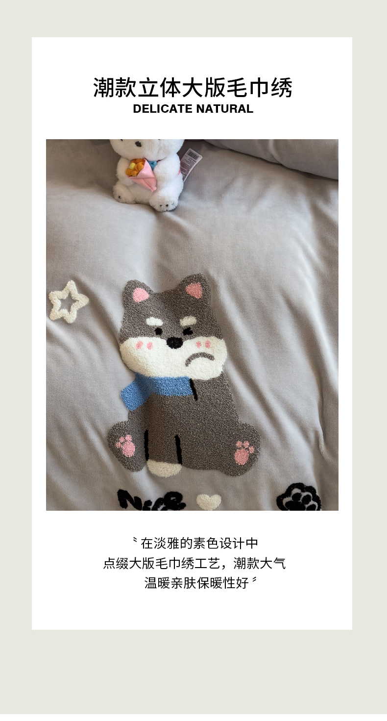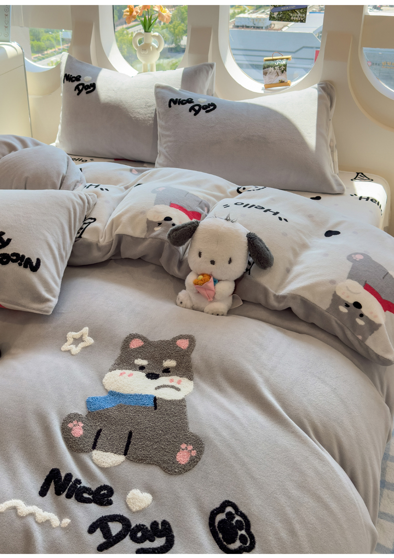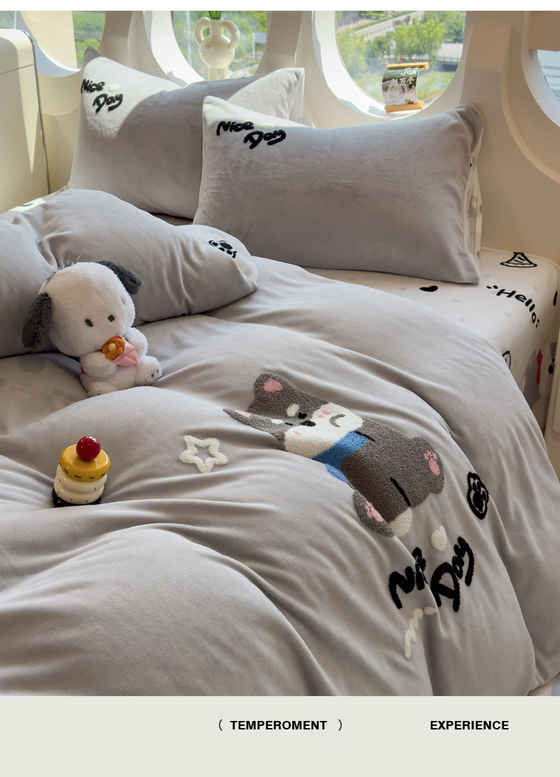当前位置: 91家纺网 > 商品网购 > 床品套件 > 四件套 > 牛奶绒四件套 > 丝羽坊 2025新款A类潮款加厚牛奶绒四件套 灰调萌犬
