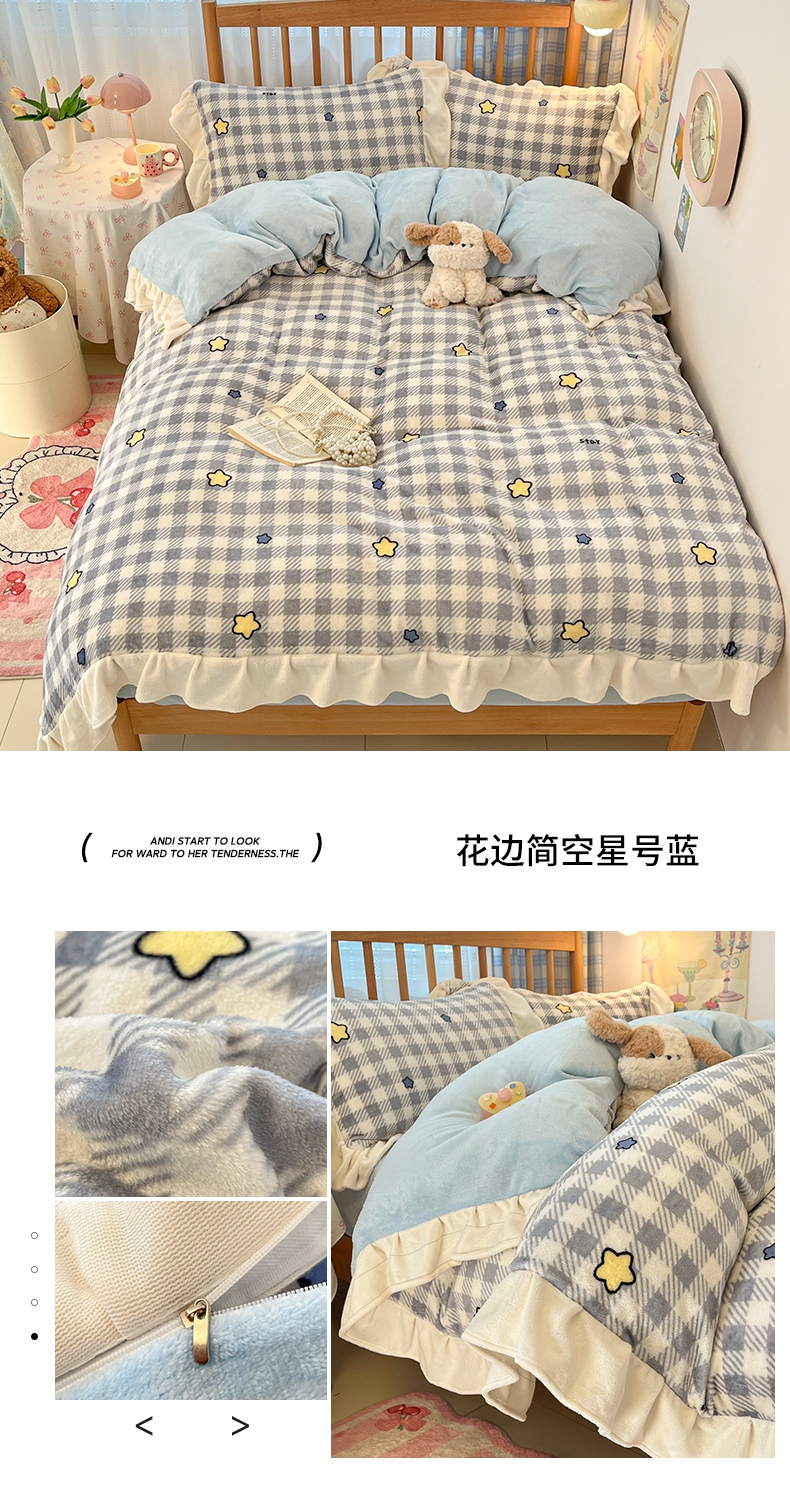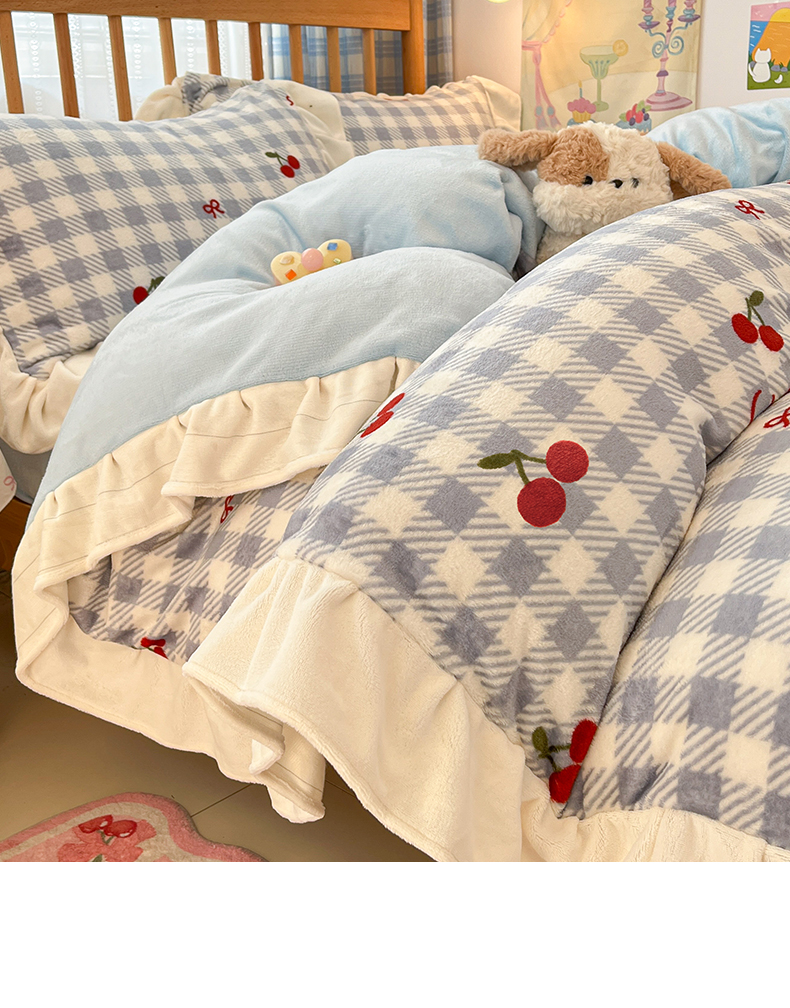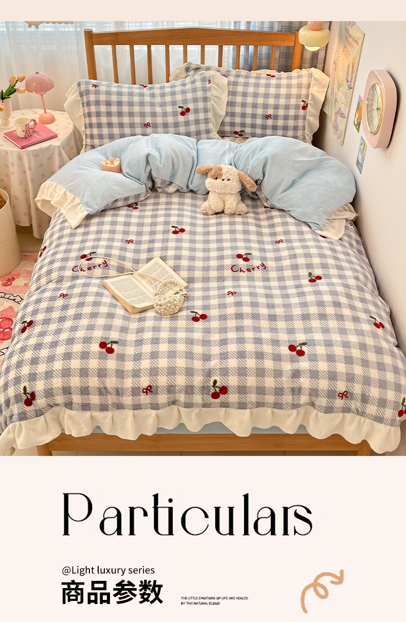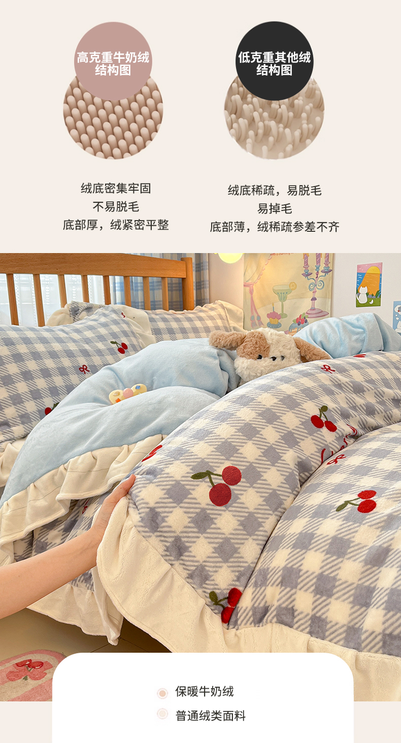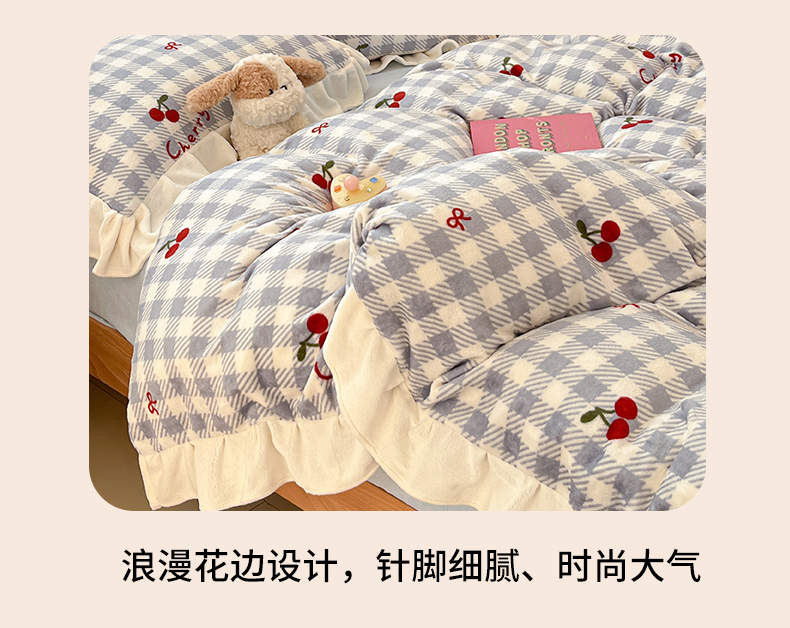 当前位置: 91家纺网 > 商品网购 > 床品套件 > 四件套 > 牛奶绒四件套 > 川悦生活 2025新款A类韩版花边牛奶绒四件套 花边青天车厘