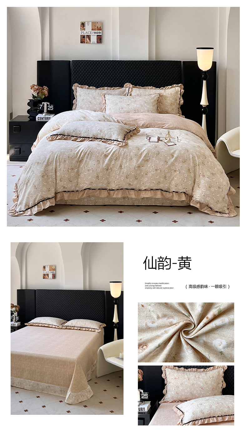 金纱玉纺家纺 2025新款古法水洗花边床裙床单四件套 仙韵-黄