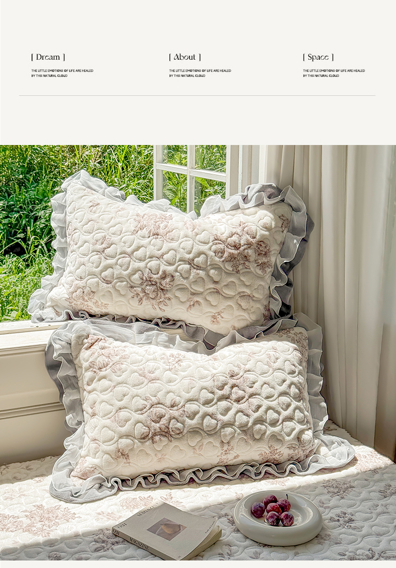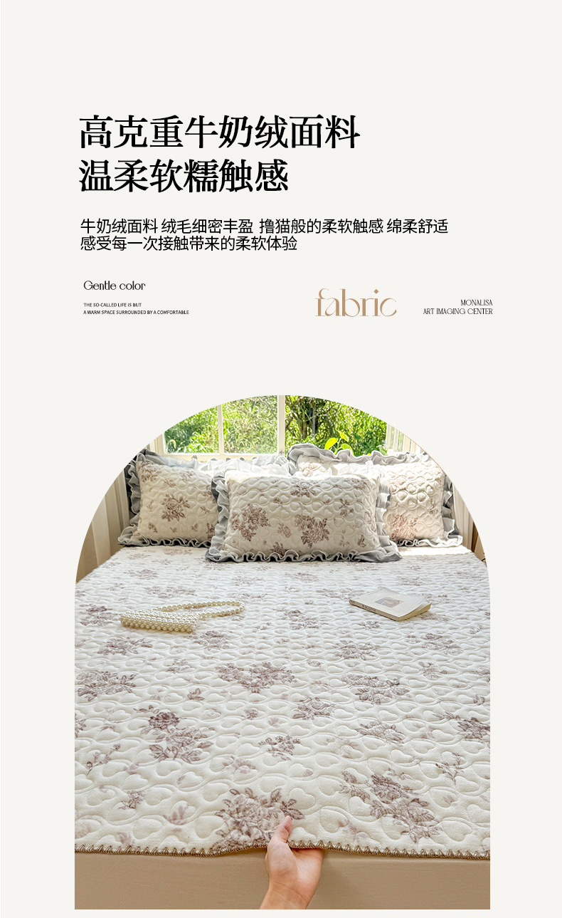 (总)禧缘家纺(原梦想家) 2025新款夹棉双层花边牛奶绒床笠三件套系列,布布乐园,步步生花,杏花微雨,雾都茶花,摩卡小镇,猫咪心事,浪漫花开,蓝铃风语,狗狗岛屿,落日云舒