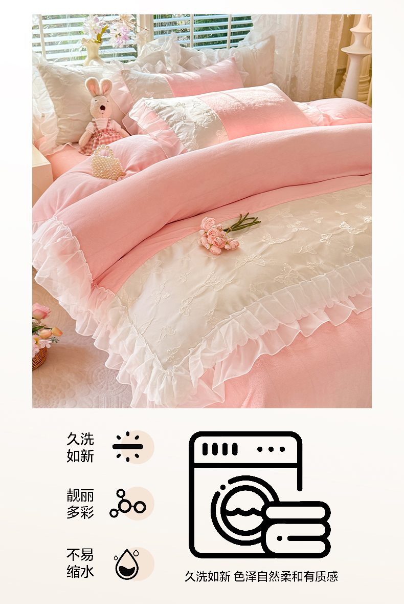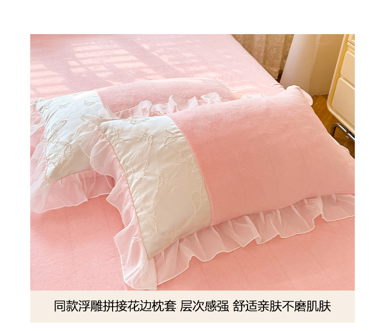 商品名称:艾米家居 2025秋冬新款浮雕牛奶绒花边四件套 粉色