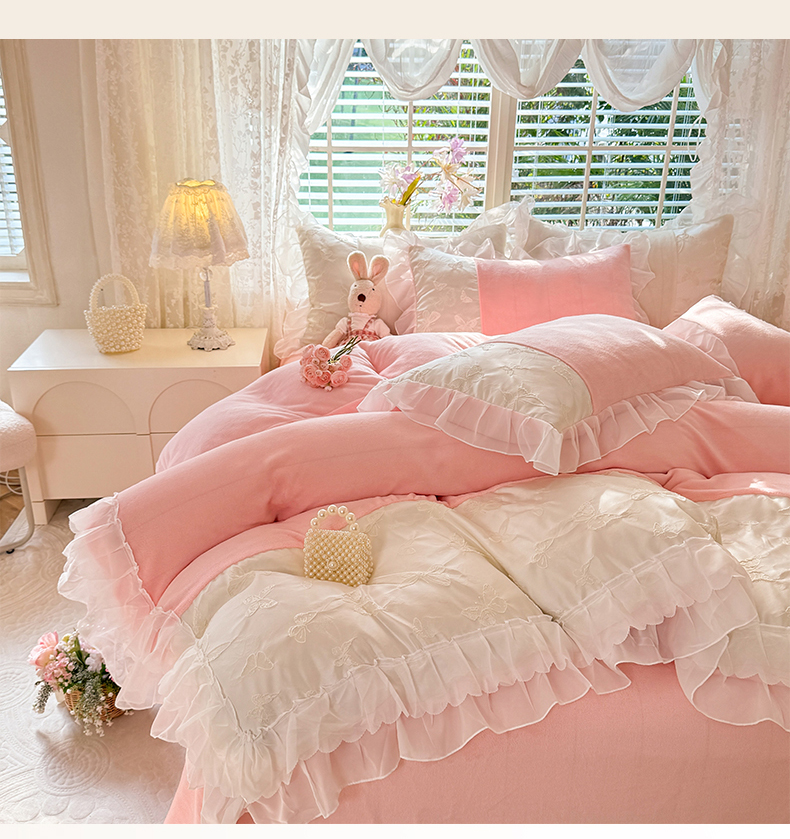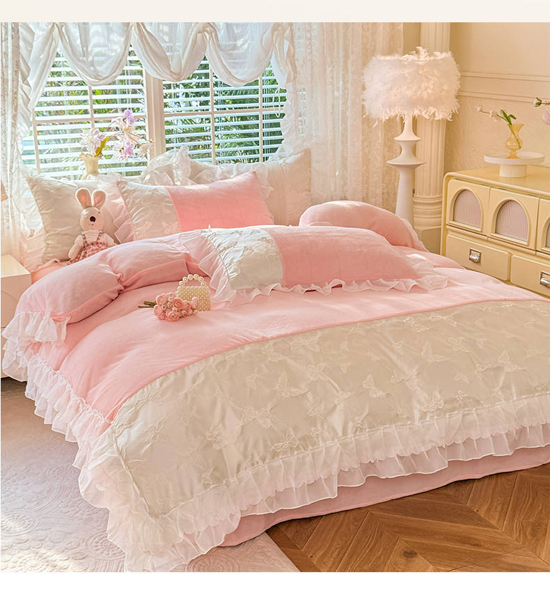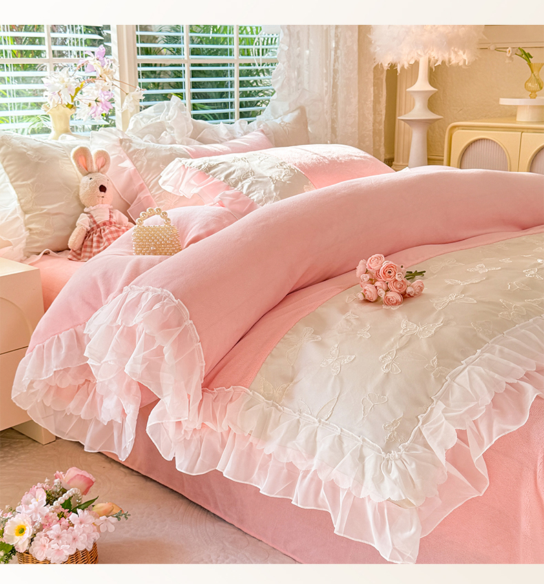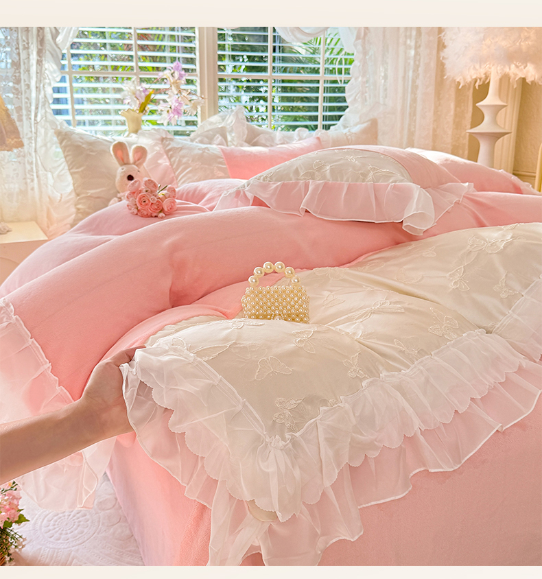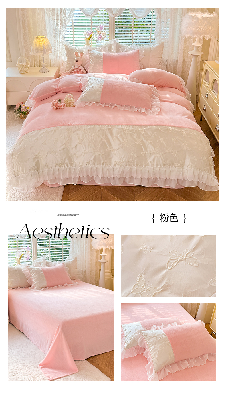 艾米家居 2025秋冬新款浮雕牛奶绒花边四件套 粉色
