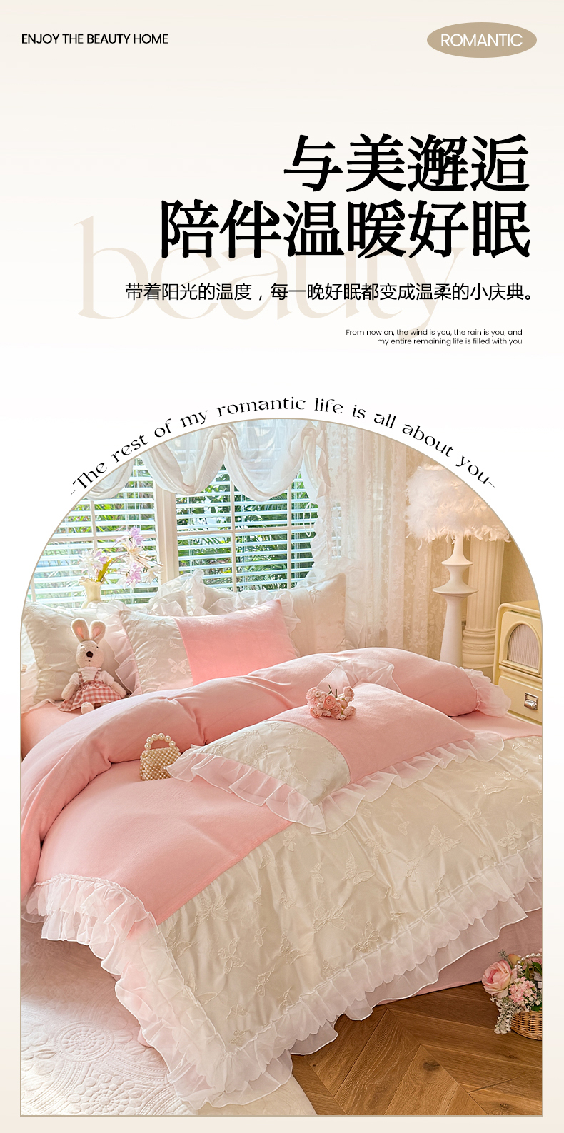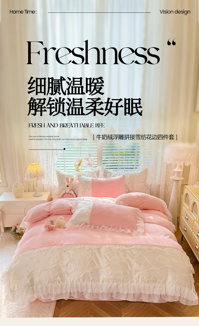 (总)艾米家居 2025秋冬新款浮雕牛奶绒花边四件套,白色,豆沙,粉色