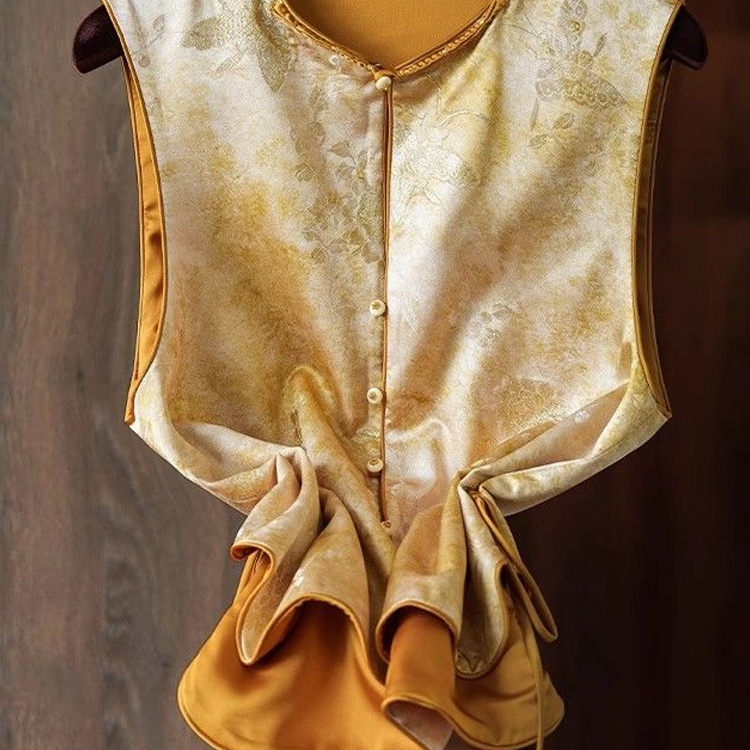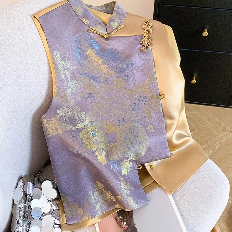 商品名称:洛兰沙家居馆【只代发】【只代发】 2025新款复古织锦缎细纱棉麻拼接马甲背心刺绣中式盘扣上衣 35