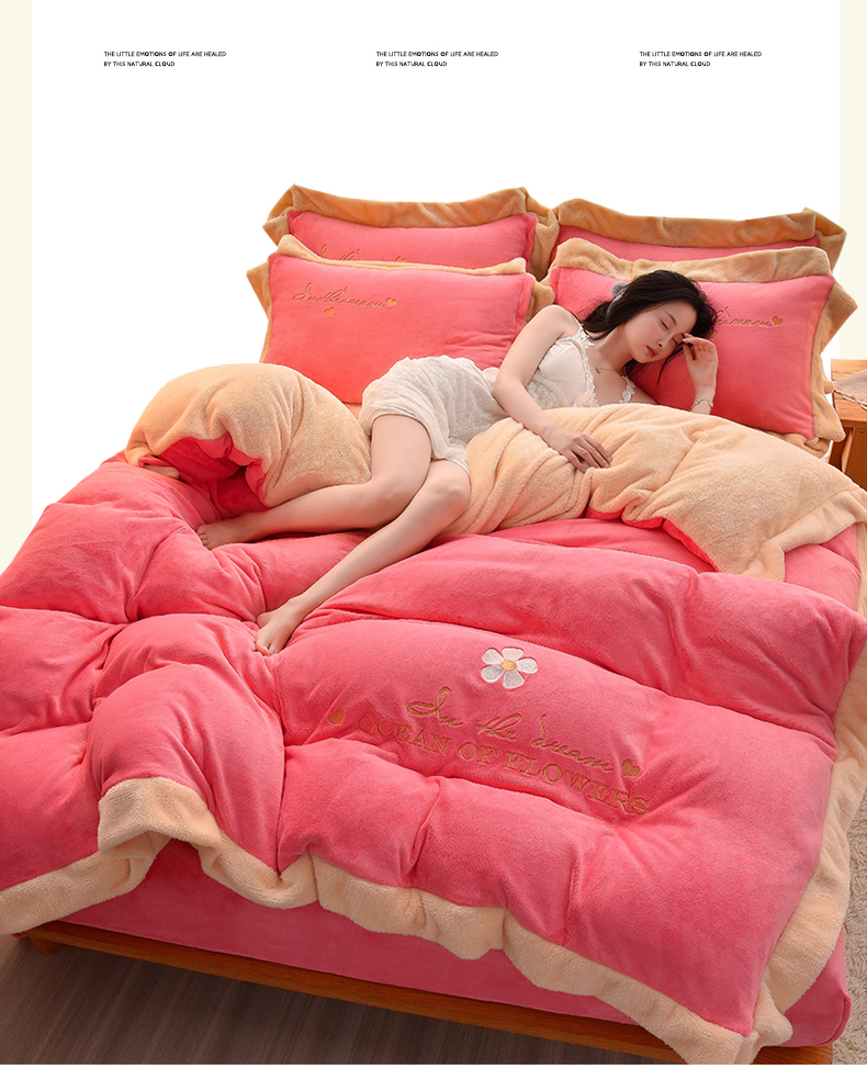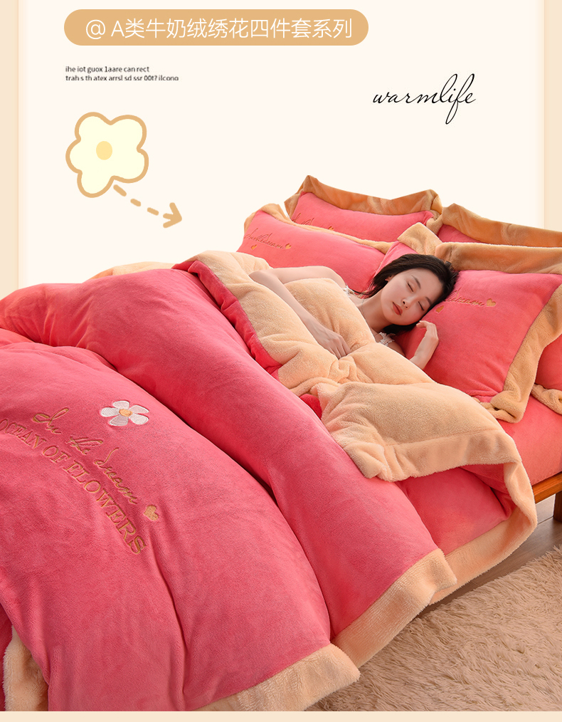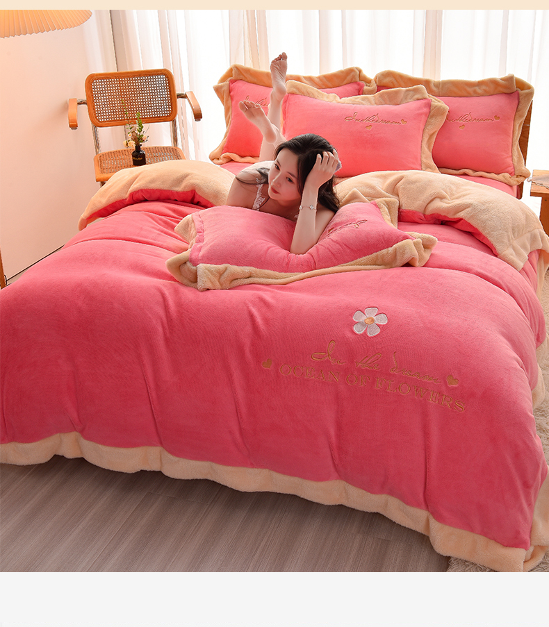 商品名称:笙意 新款牛奶绒刺绣四件套-繁花系列 繁花-玫玫红