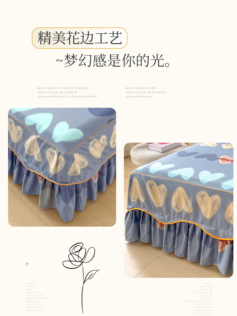 总笠裙家纺 2024新款A类原棉夹大豆棉加厚刺绣爱心款系列床裙,宝石蓝爱心款,淡粉爱心款,豆沙爱心款,高级灰爱心款,灰蓝爱心款,米白爱心款,抹茶爱心款,浅灰爱心款,雾霾蓝爱心款