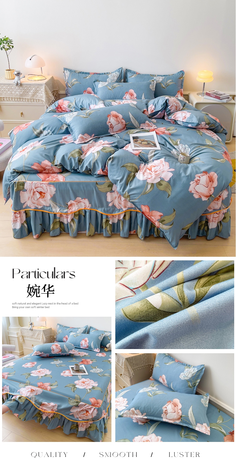 商品名称:笠裙家纺 2025新款A类水洗棉韩版S边花边印花床裙四件套 潮格