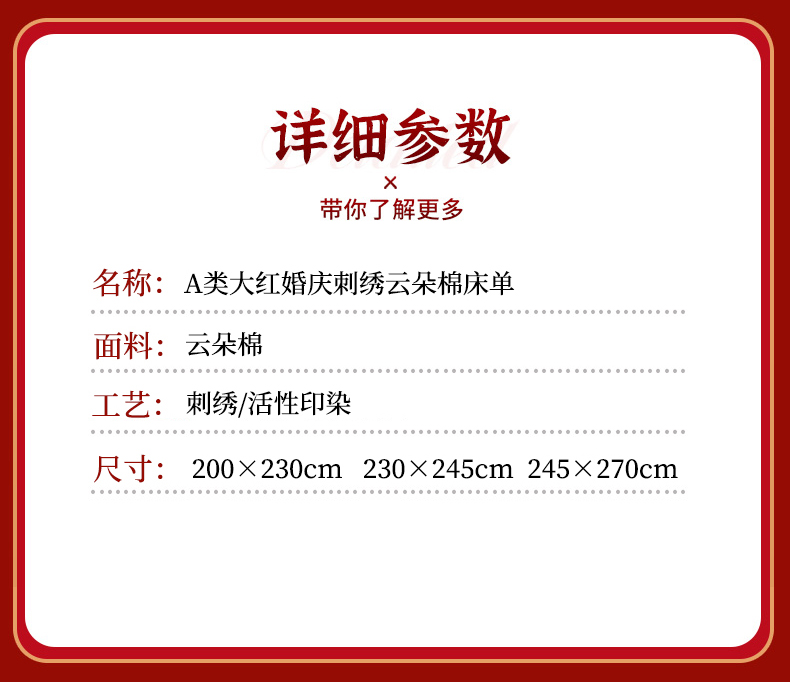商品名称:艾橙家纺 2025新款大红云朵棉刺绣婚庆系列单床单床单单件 一生挚爱