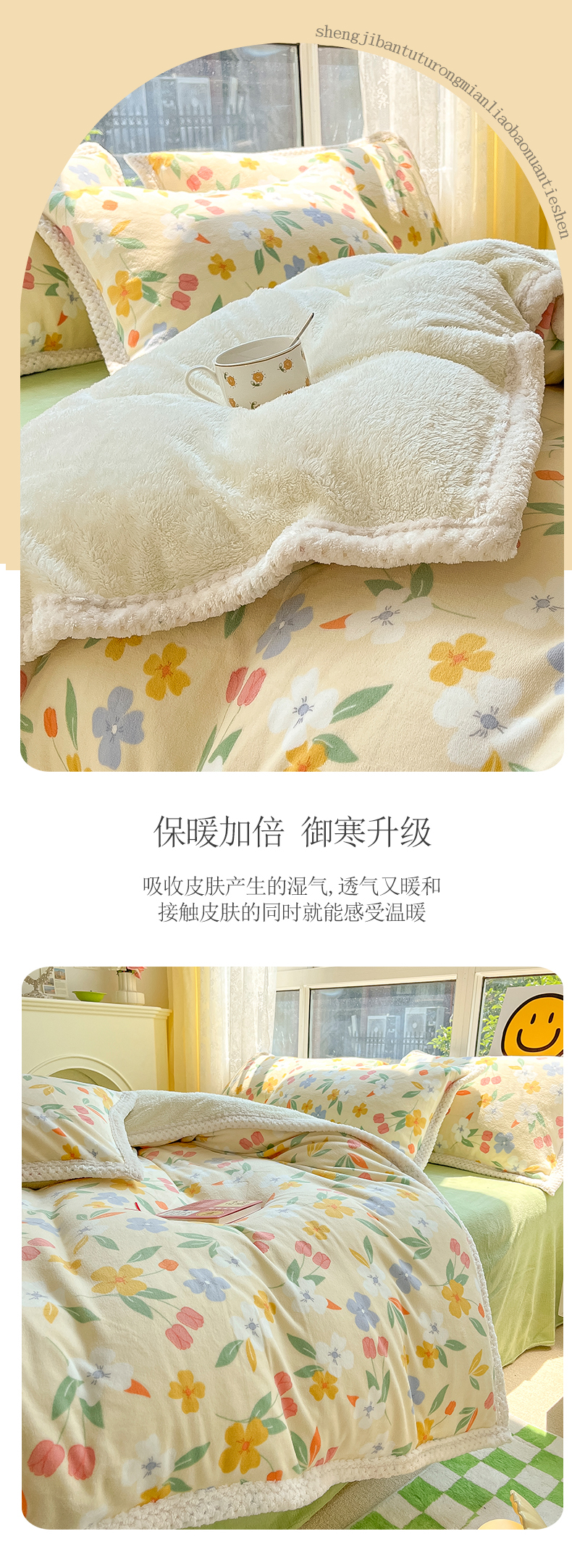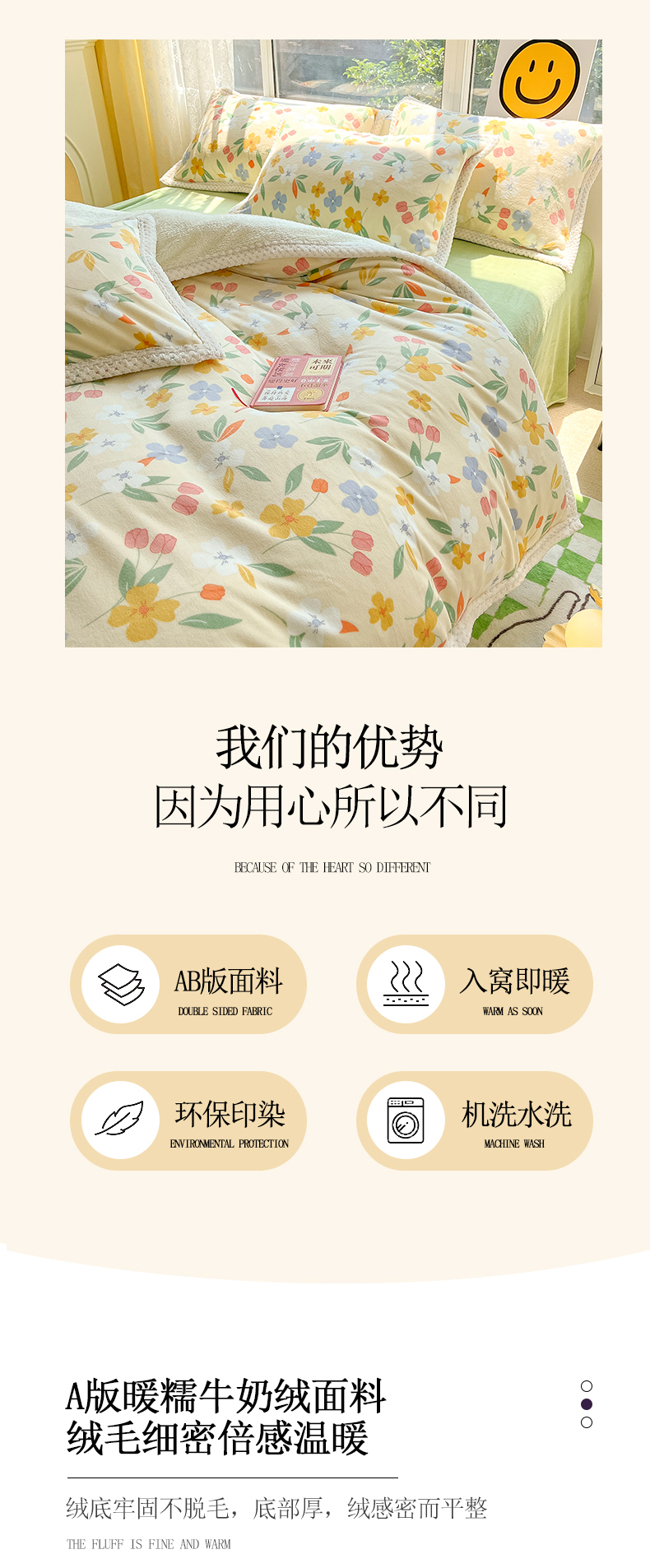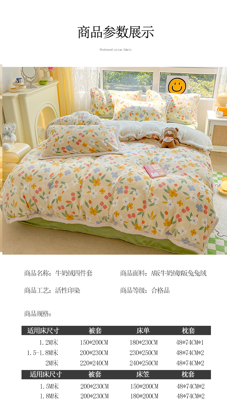 商品名称:琪格格纺织 2025新款A牛奶绒B兔兔绒保暖印花四件套 大包边绒沁香-黄