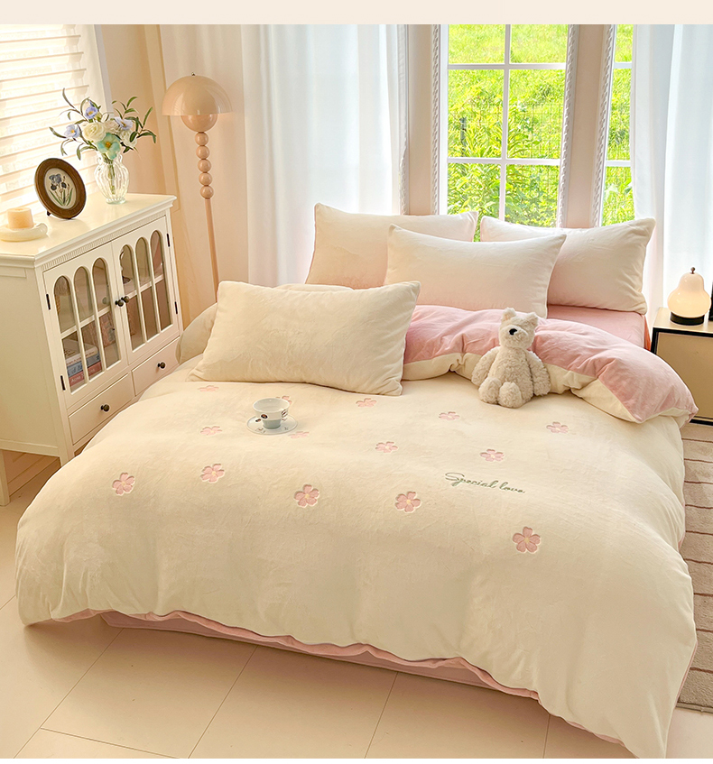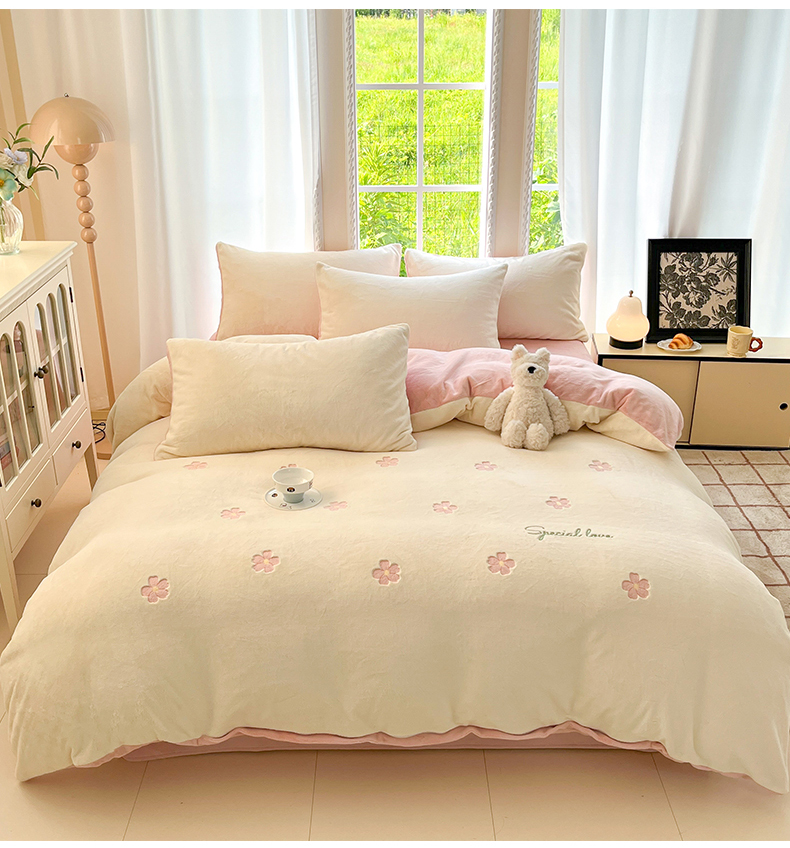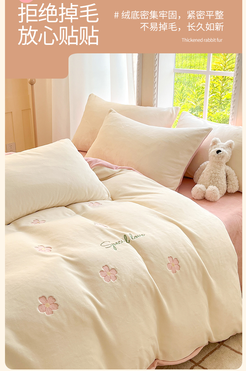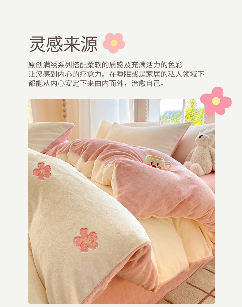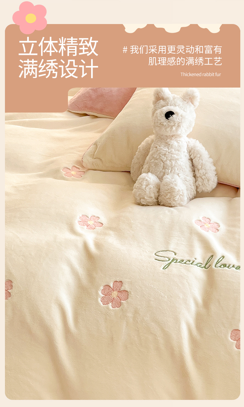 云棉坊 2025新款高克重牛奶绒四件套-满绣系列 花朵-奶白粉