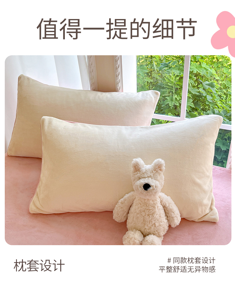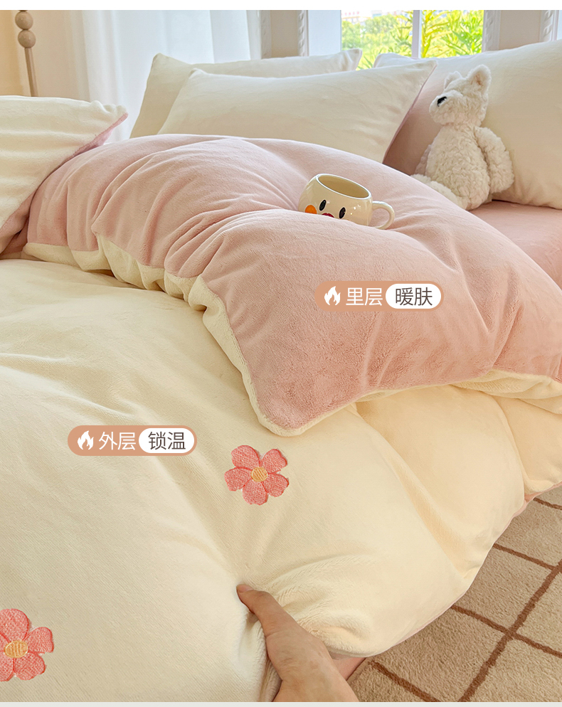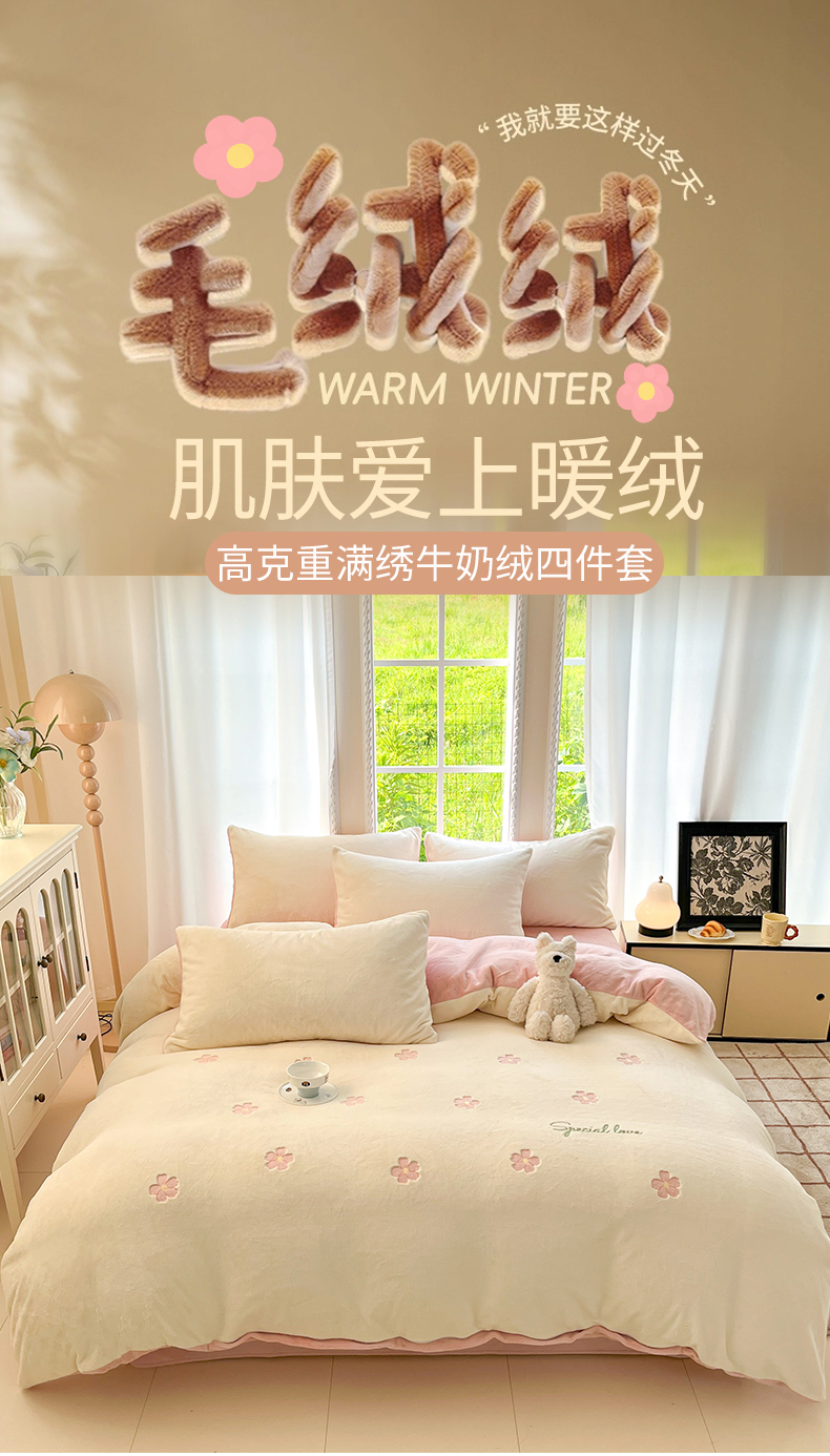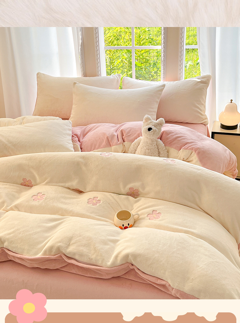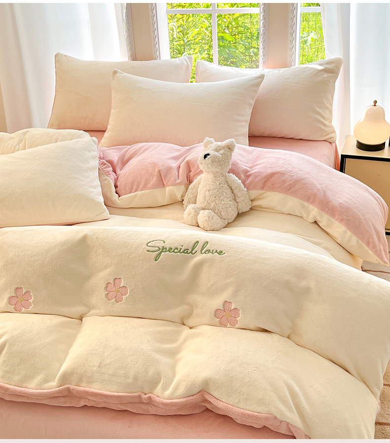 云棉坊 2025新款高克重牛奶绒四件套-满绣系列 花朵-奶白粉
