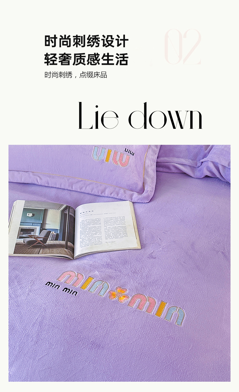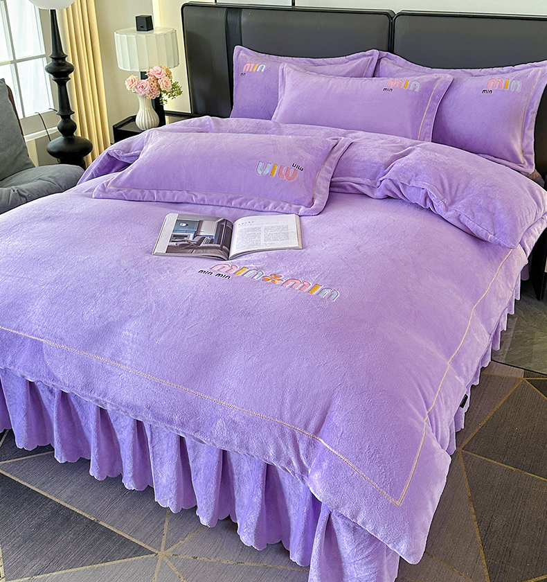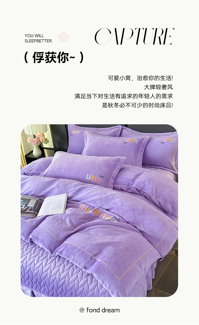 (总)柏薇 2025新款高克重牛奶绒绣花床盖四件套-缪系列,豆沙色,粉色,灰色,梦幻紫,奶蓝色,清新绿