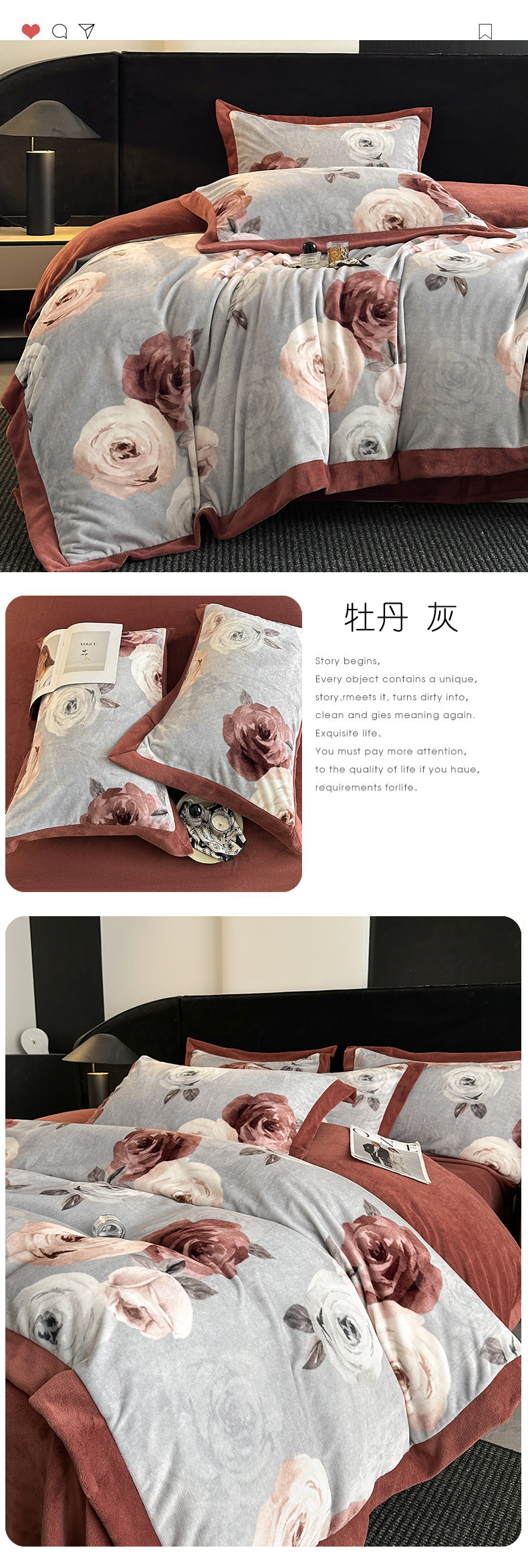 商品名称:花漾家居 2025新款轻奢复古格条民族宽边牛奶绒四件套牡丹花 灰