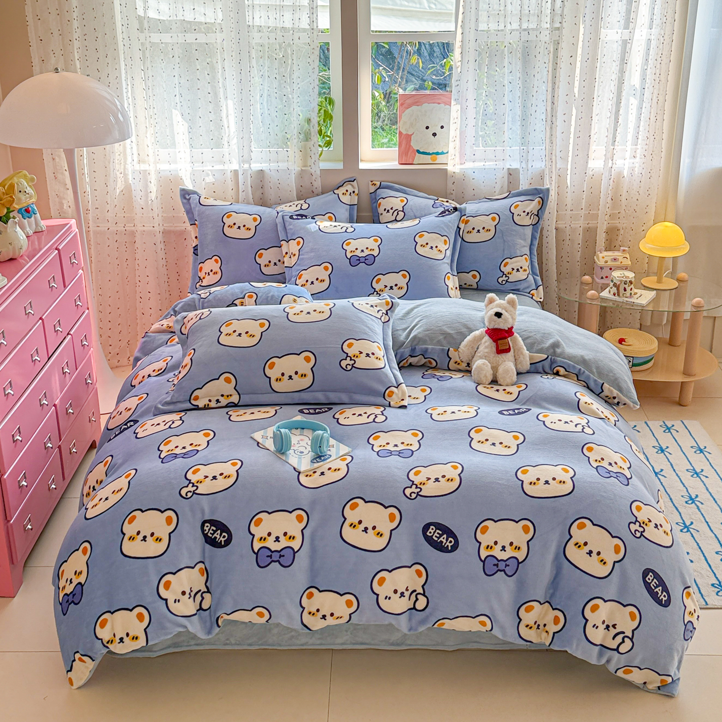 (总)慕尚家纺 2025新款豆豆绒刺绣四件套,大耳狗 白蓝,玫瑰 白粉