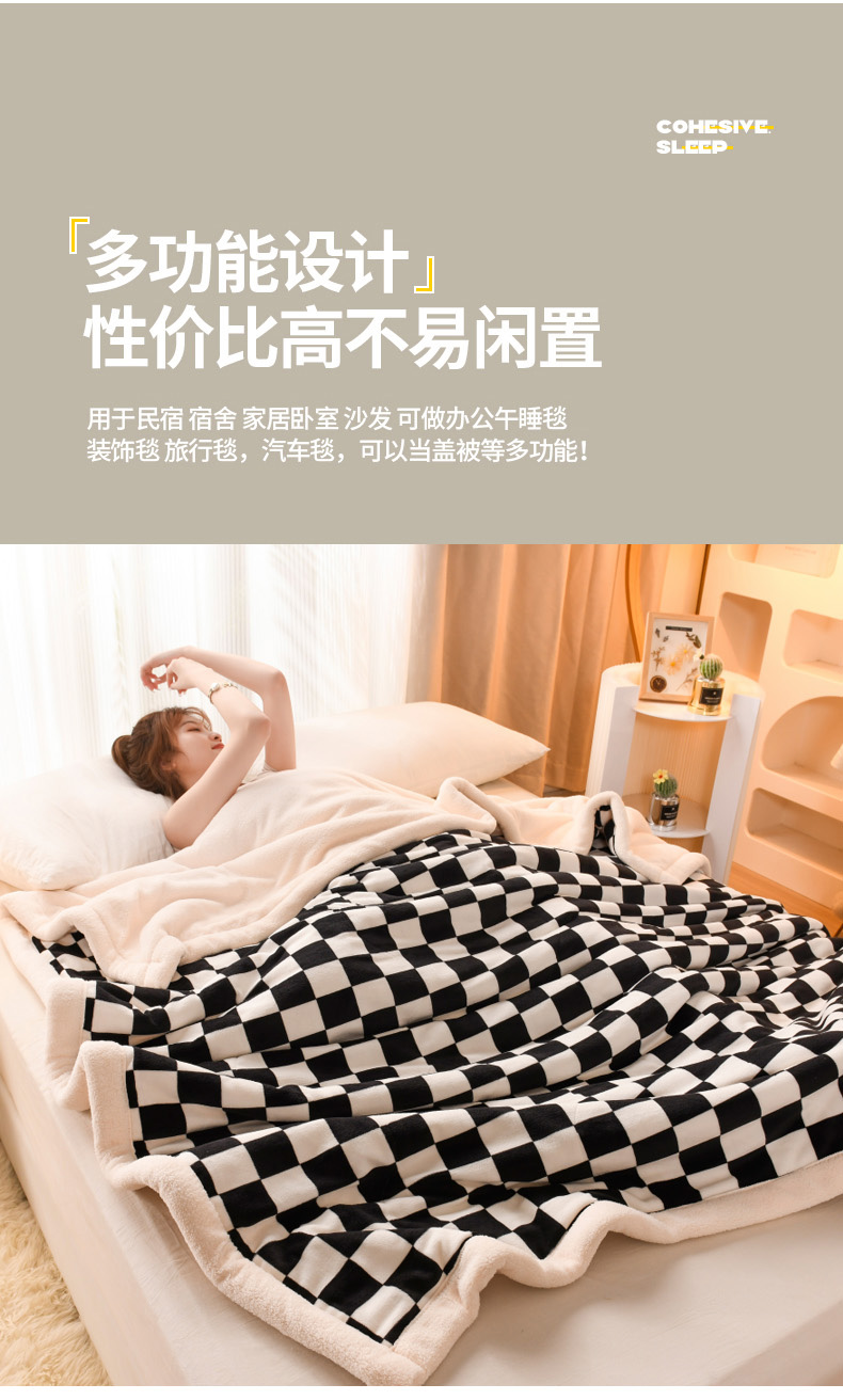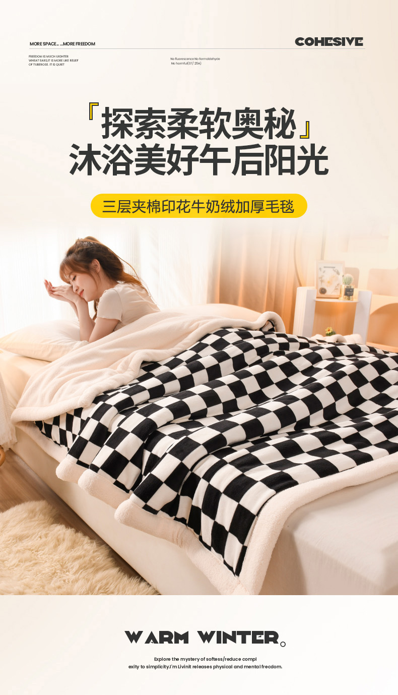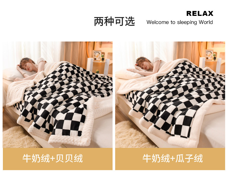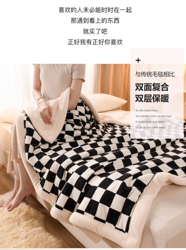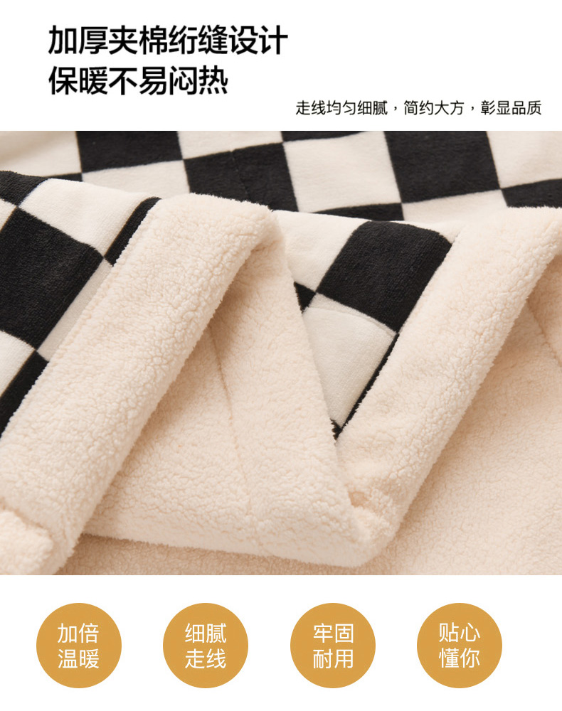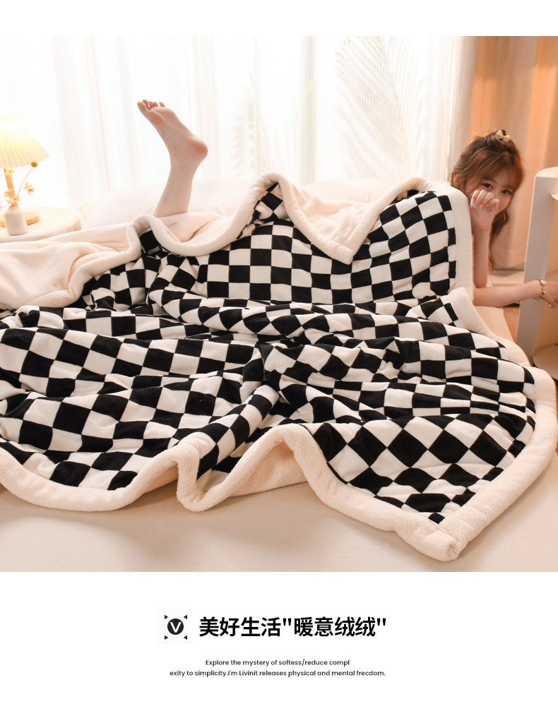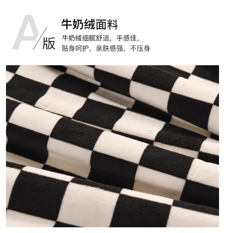 印季家纺 2025新款三层夹棉印花牛奶绒毛毯毯子 棋盘格-黑-羊羔绒