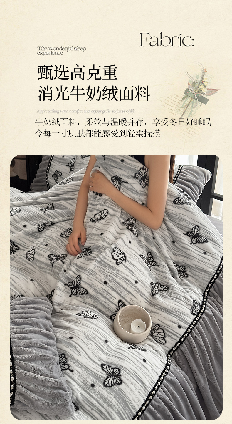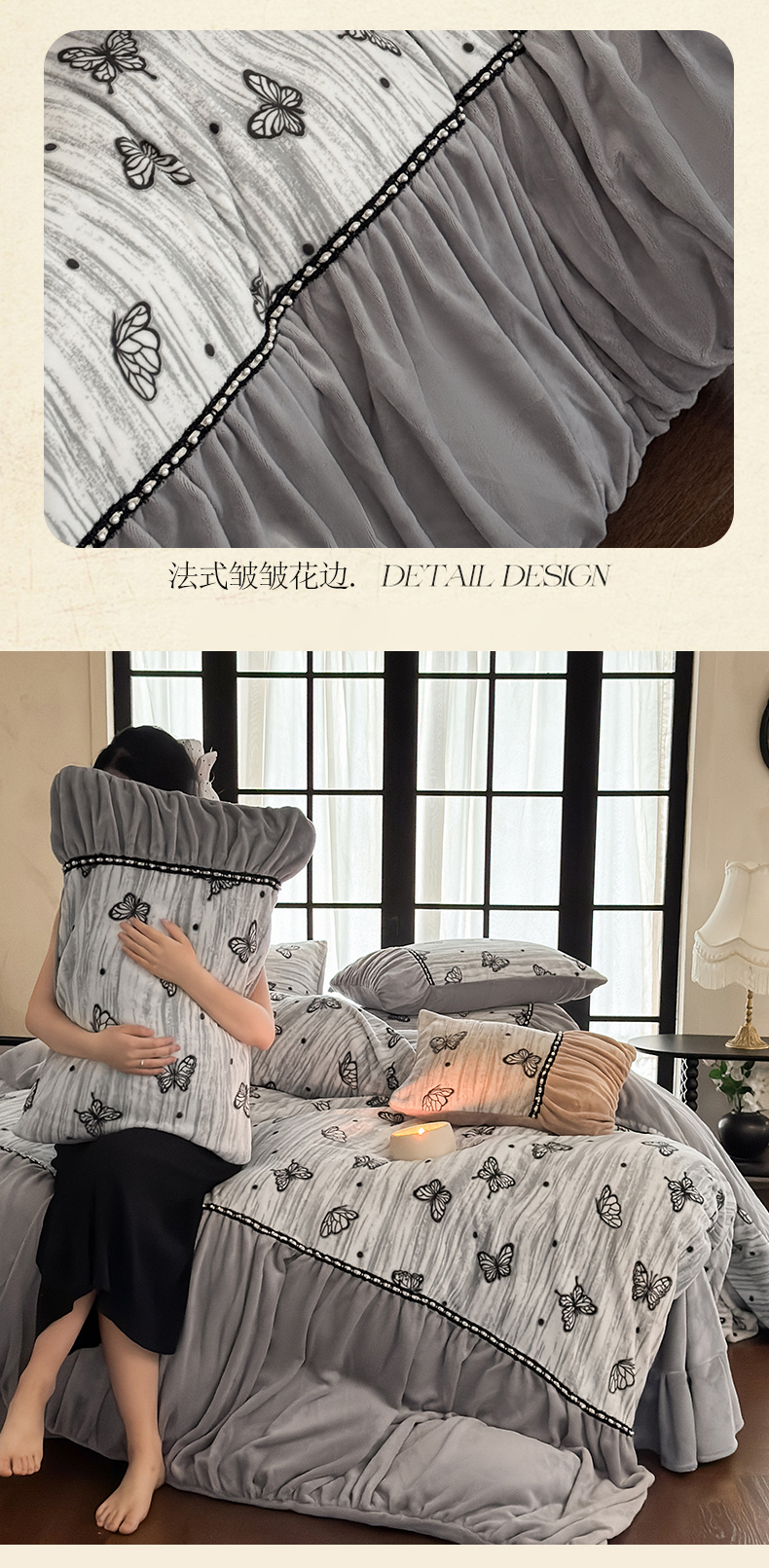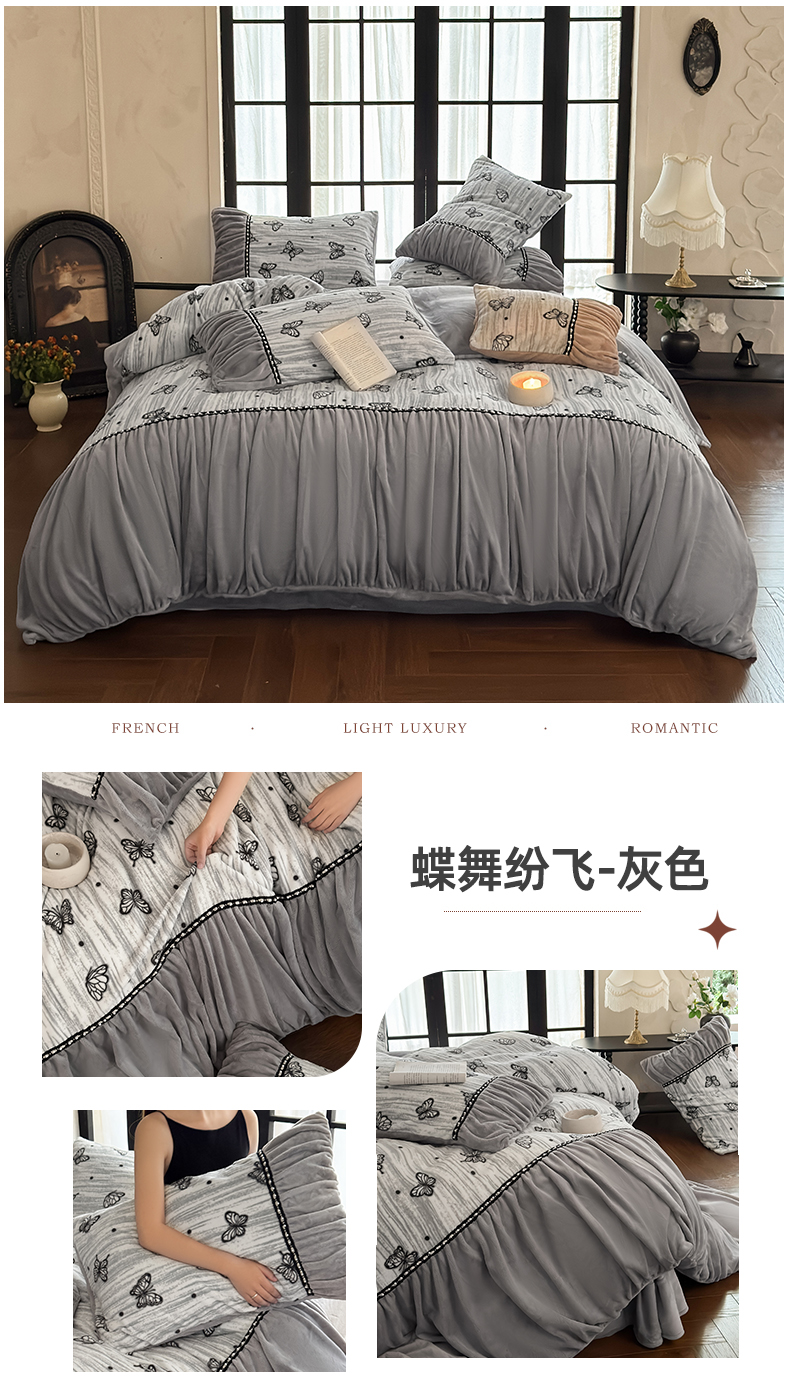 商品名称:纯优家纺 2025新款秋冬法式复古风邹邹边雕花牛奶绒四件套-蝶舞纷飞 蝶舞纷飞-灰色