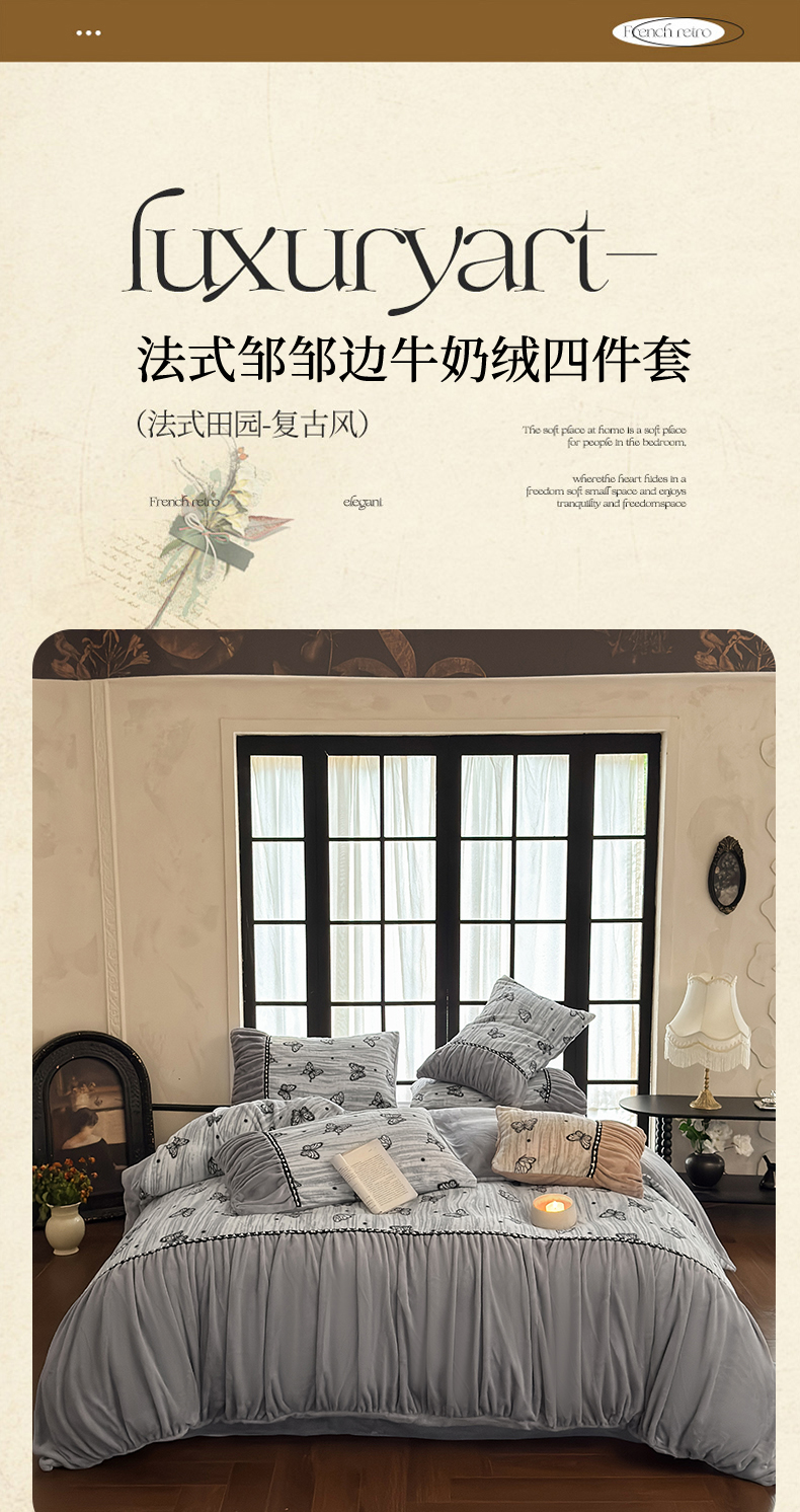 (总)纯优家纺 2025新款秋冬法式复古风邹邹边雕花牛奶绒四件套-蝶舞纷飞,蝶舞纷飞-灰色,蝶舞纷飞-奶咖