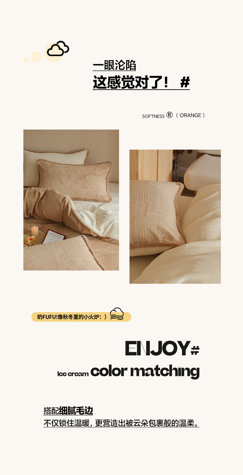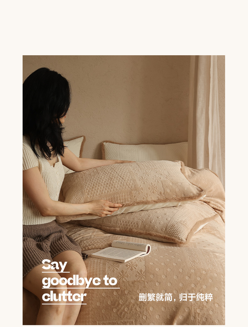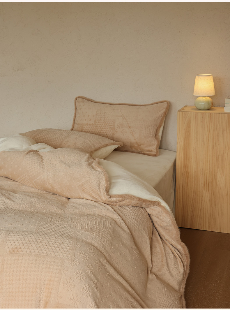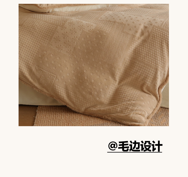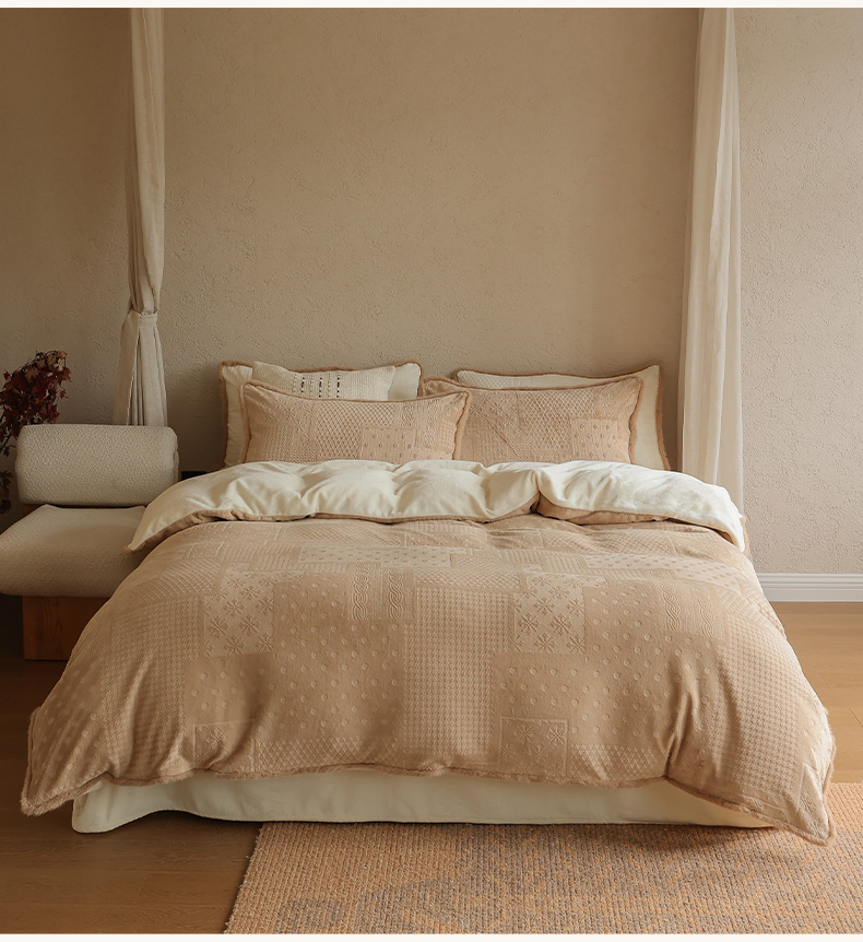 商品名称:三味舒屋 2025新款简约毛边雕花牛奶绒四件套 雪屿织梦 雪屿织梦-咖