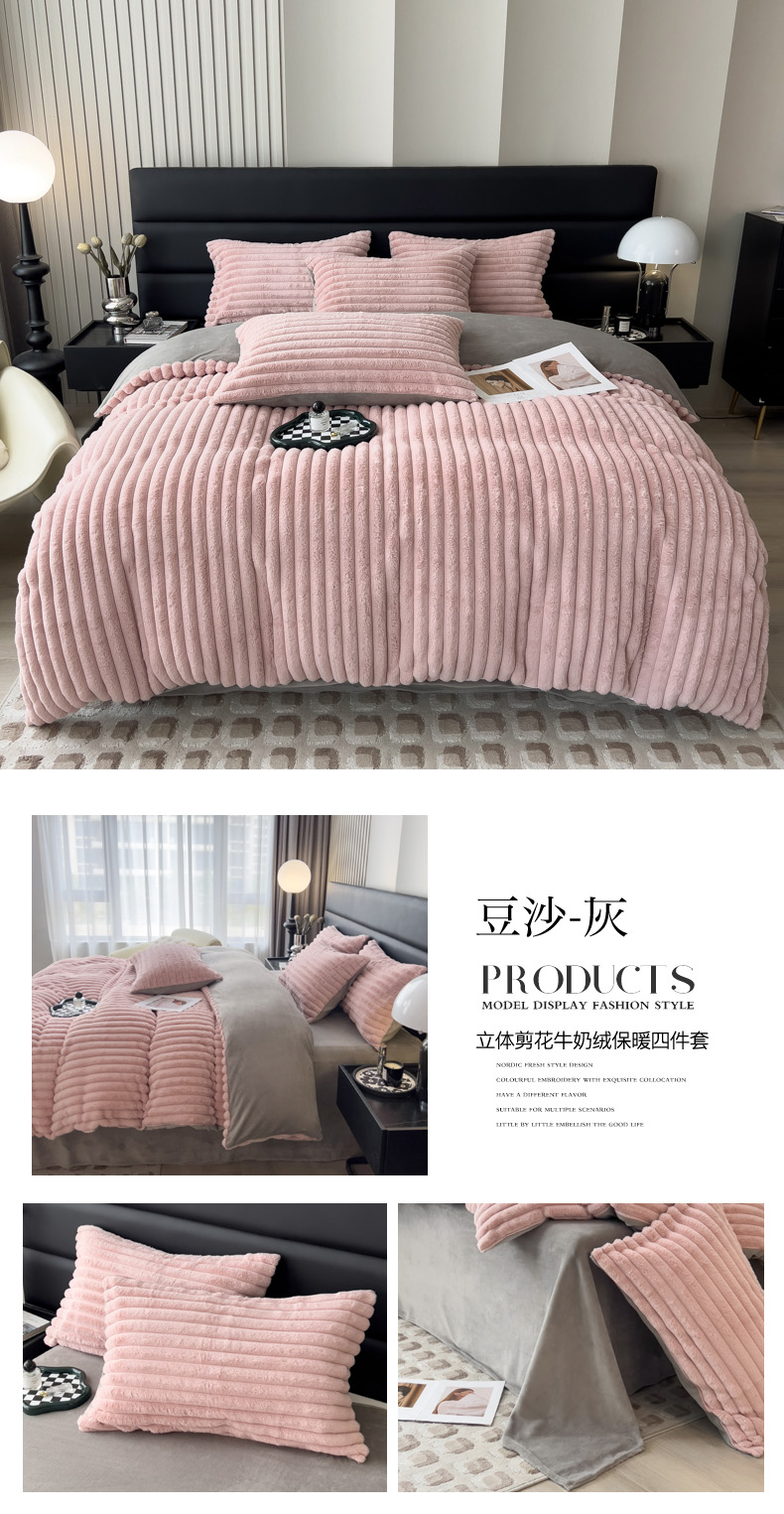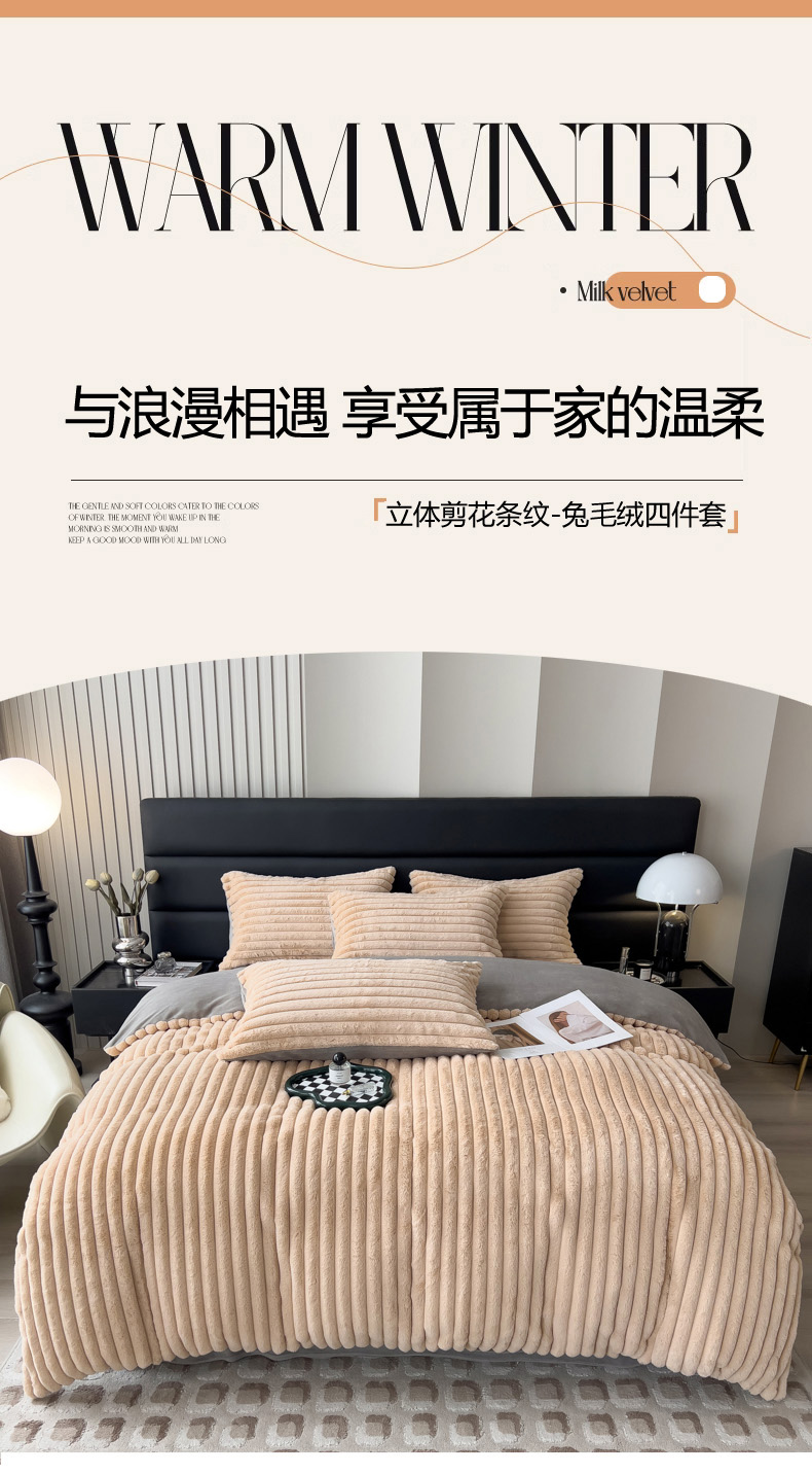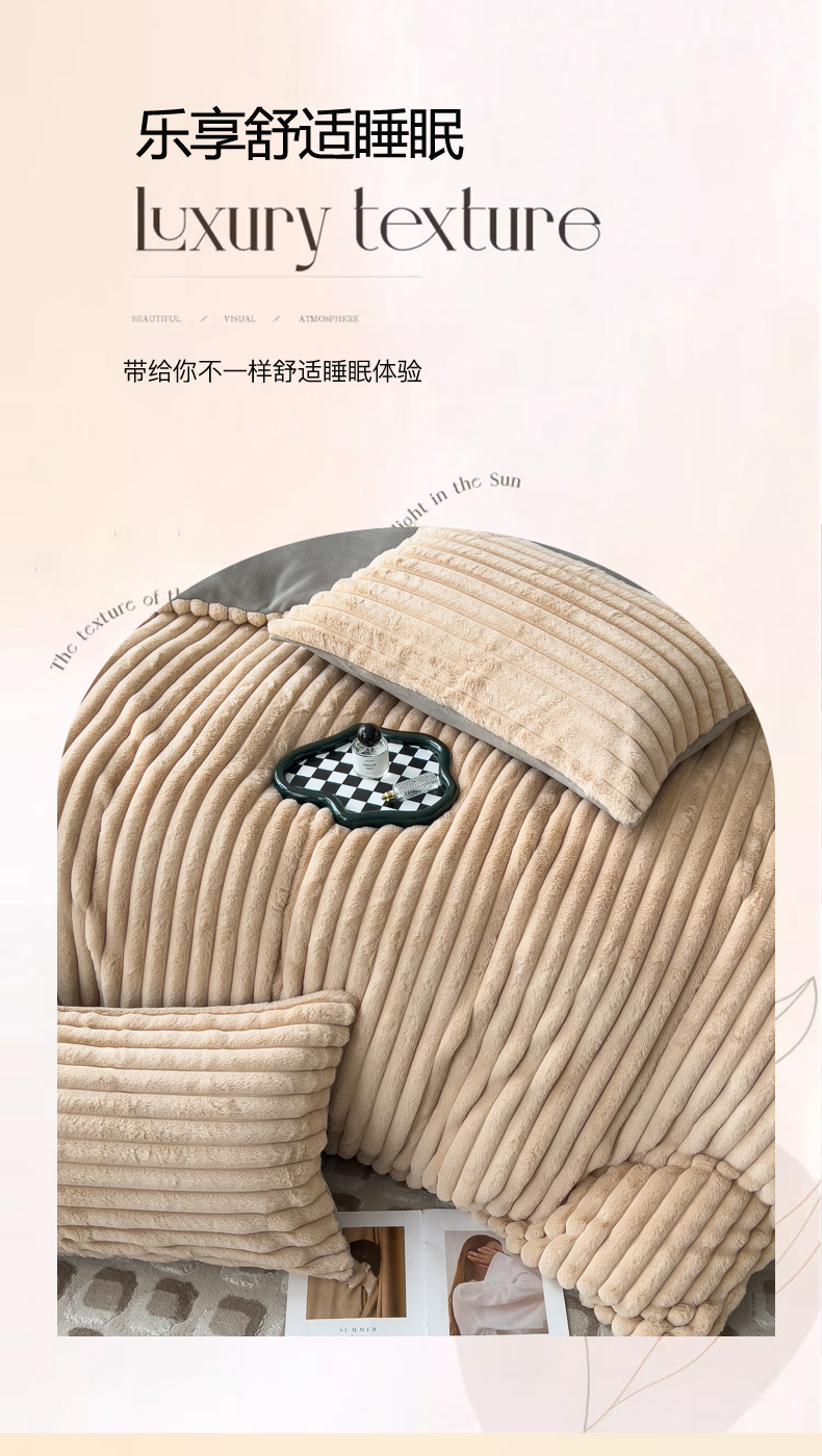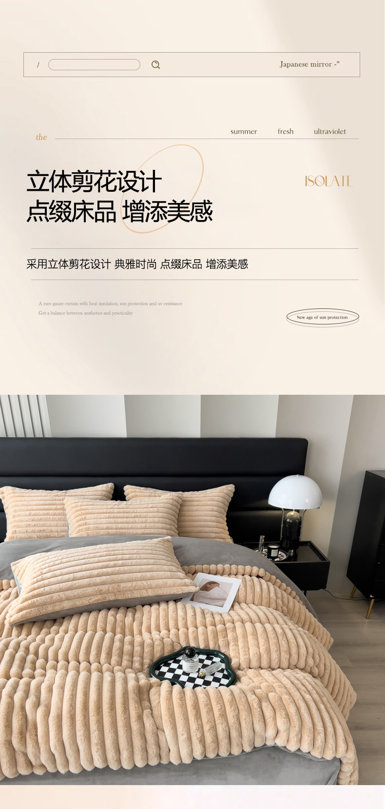 当前位置: 91家纺网 > 商品网购 > 床品套件 > 四件套 > 兔毛绒四件套 > 印季家纺 2025新款立体剪花条纹兔毛绒四件套 卡其-灰