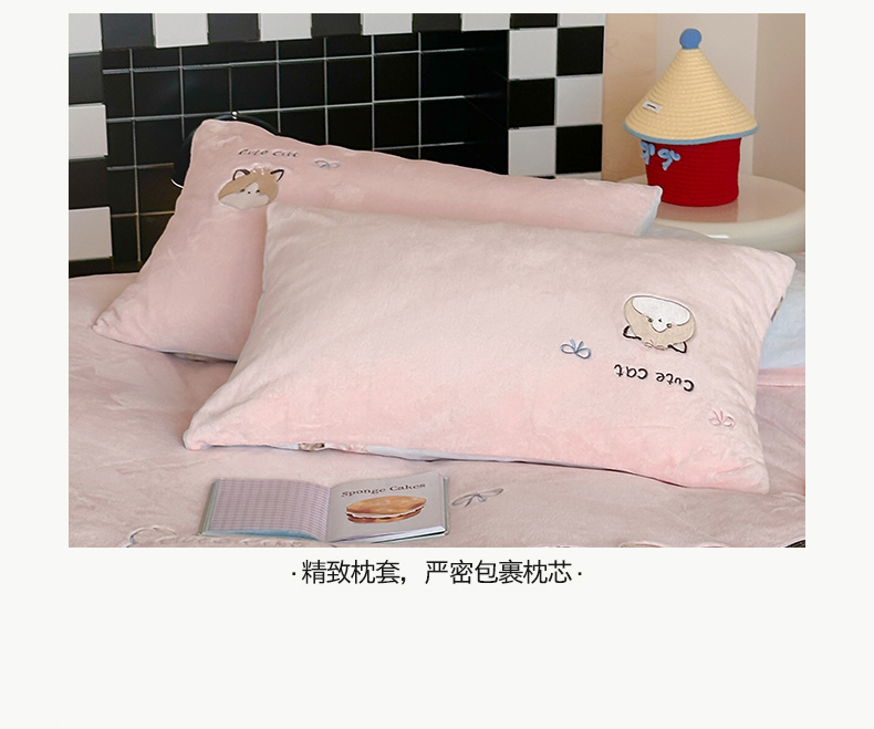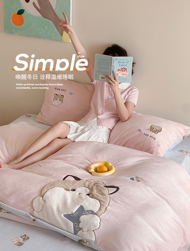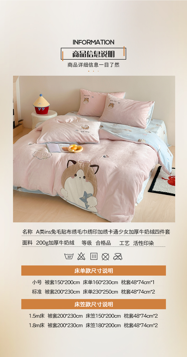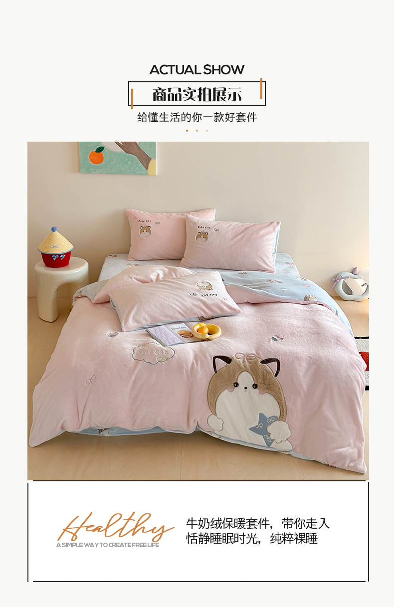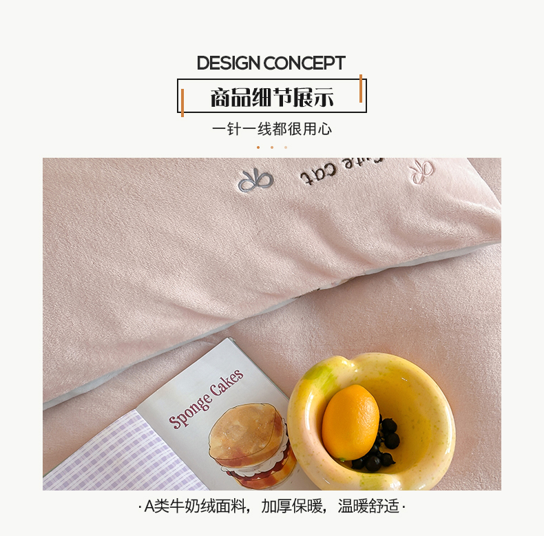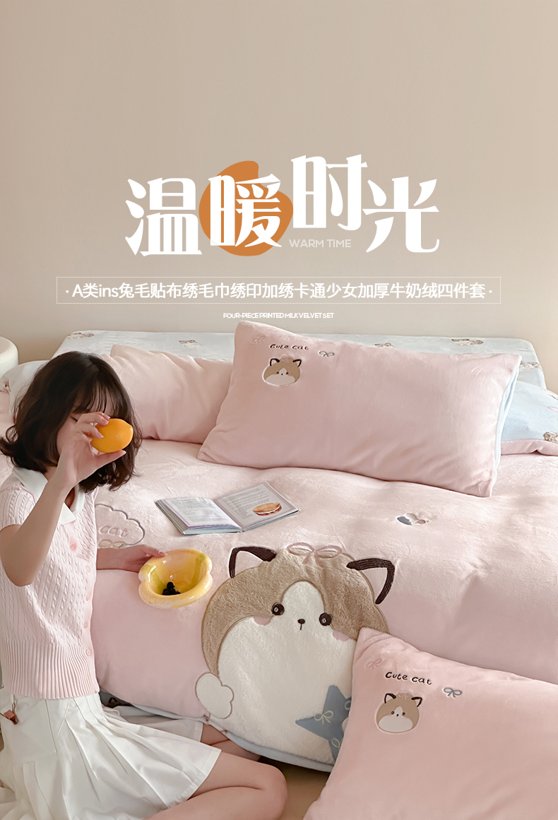 商品名称:桃子家居 2025新款A类ins兔毛贴布绣毛巾绣印加绣卡通少女加厚牛奶绒系列四件套 绒贴布绣-公主猫