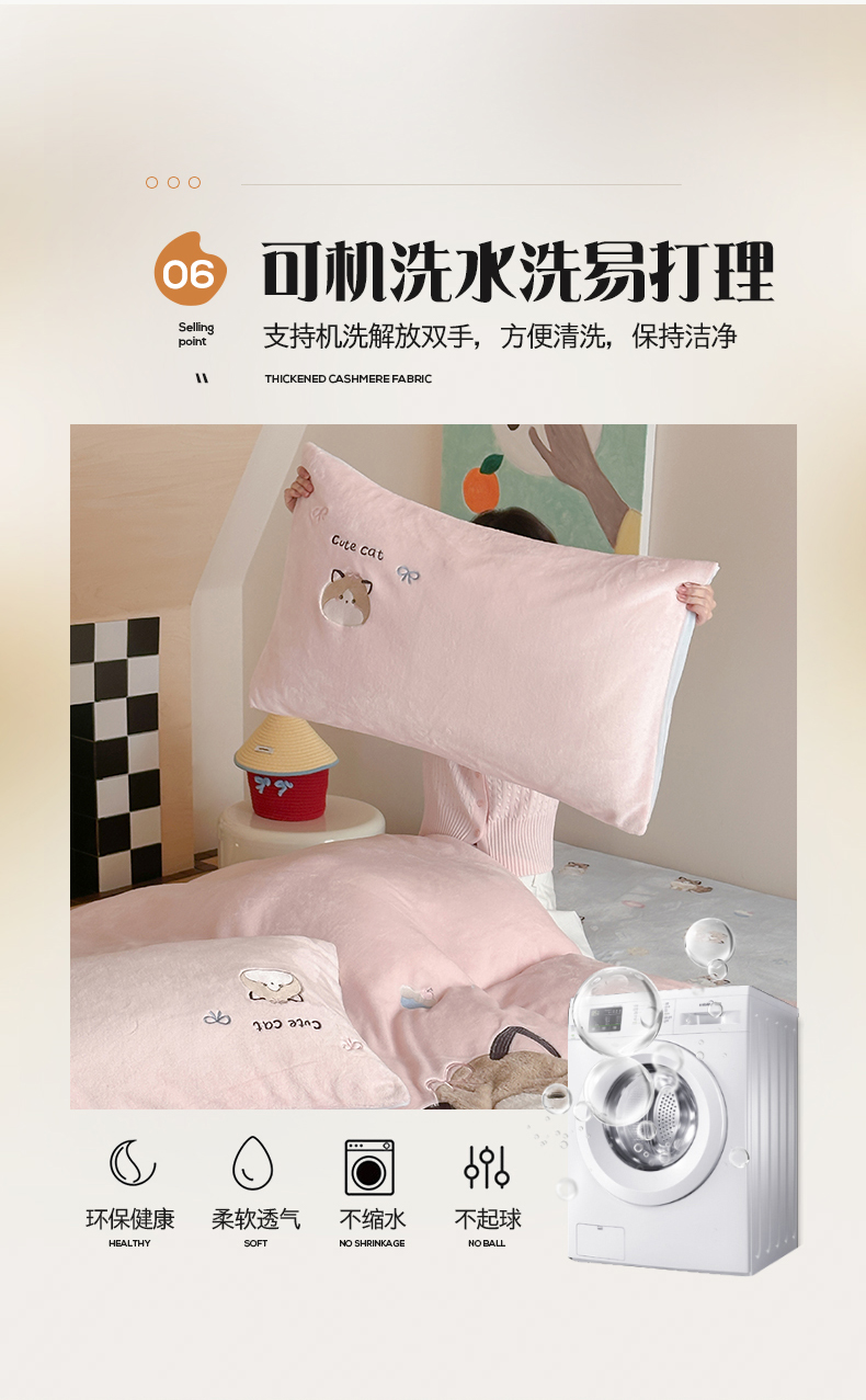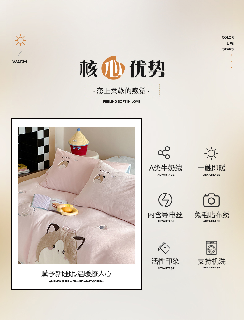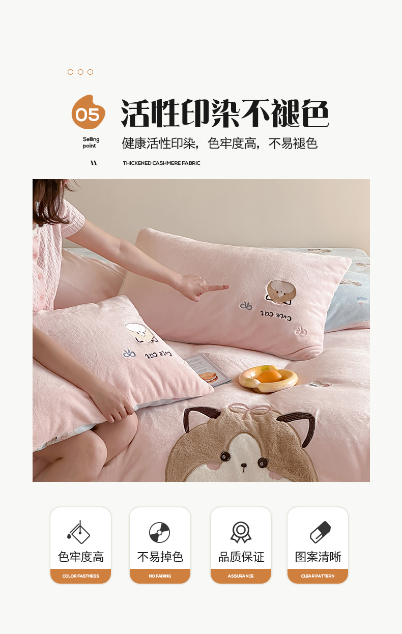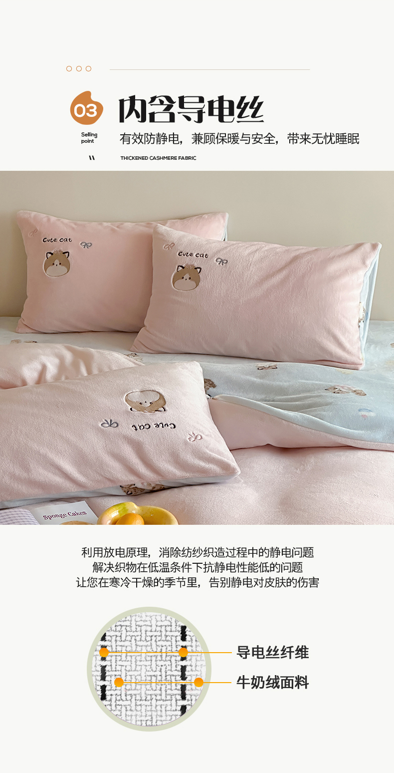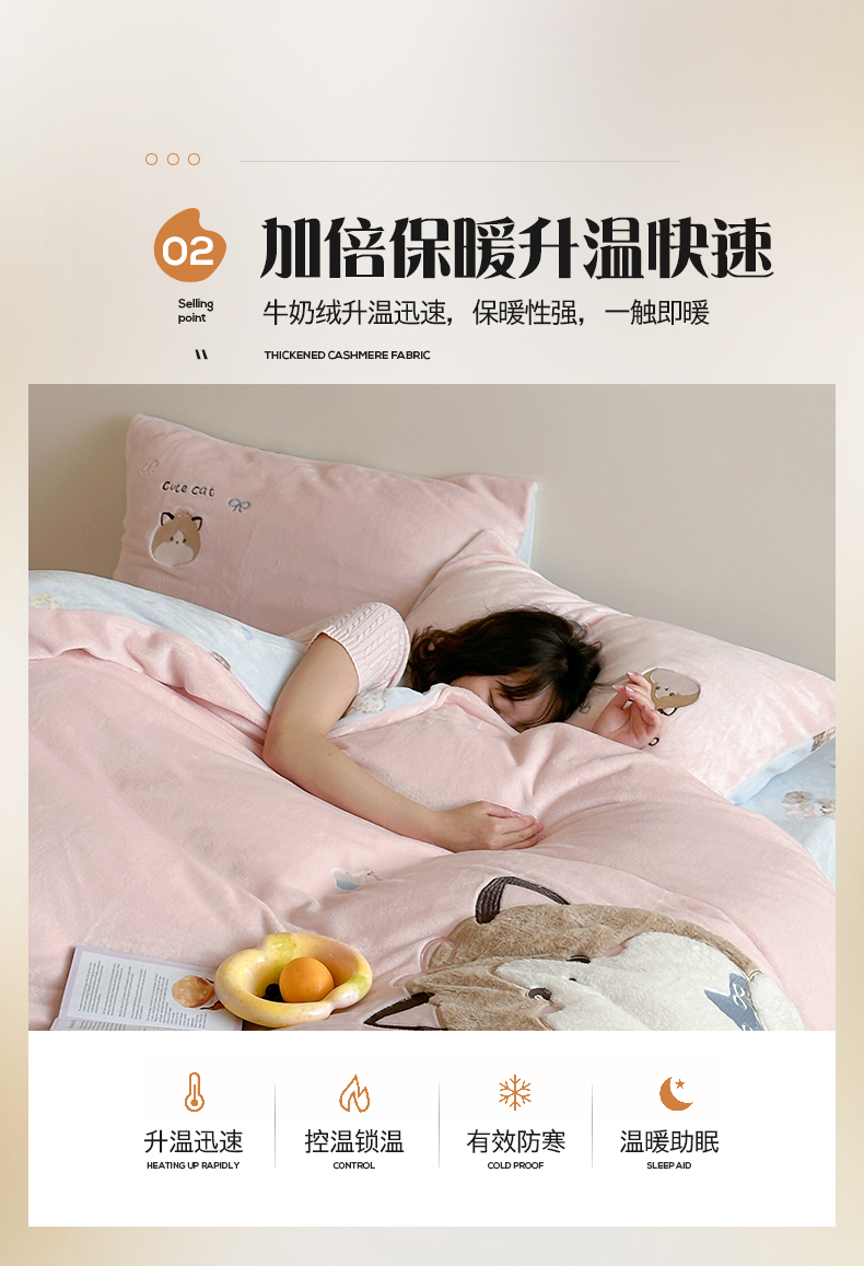 商品名称:桃子家居 2025新款A类ins兔毛贴布绣毛巾绣印加绣卡通少女加厚牛奶绒系列四件套 绒贴布绣-公主猫