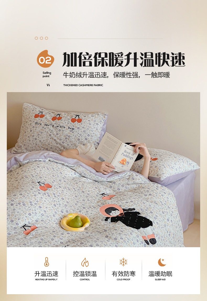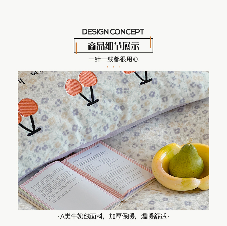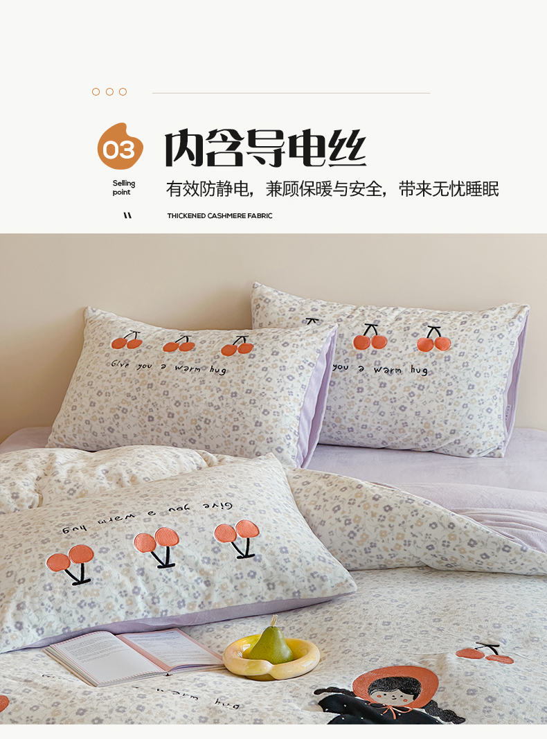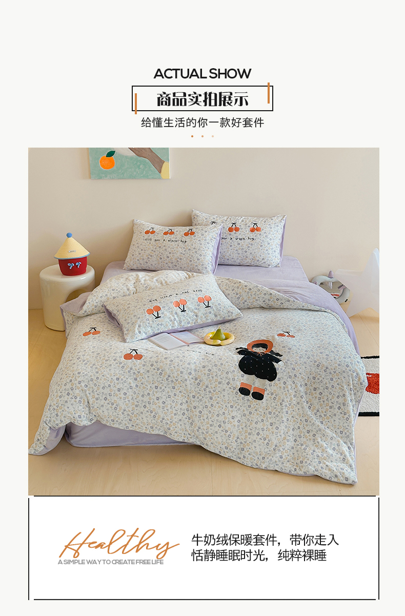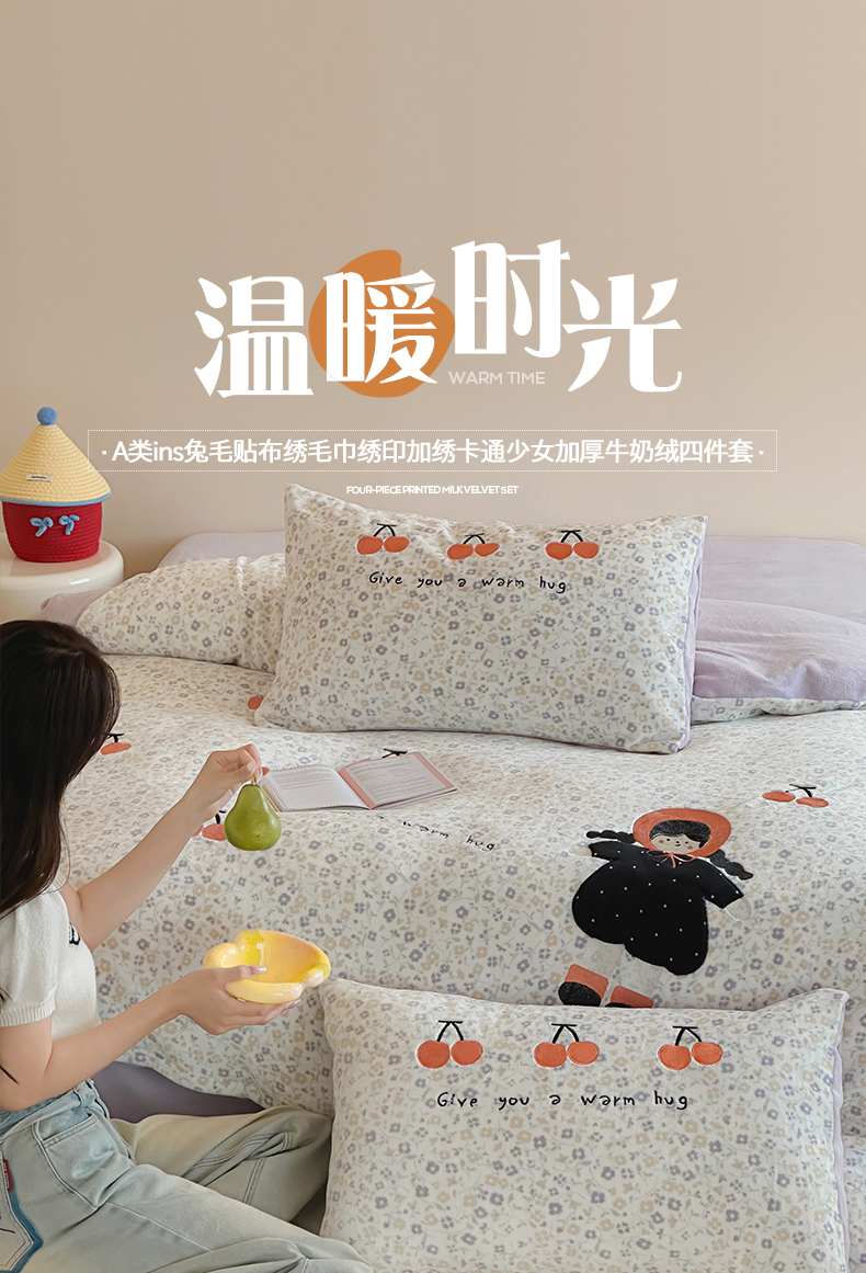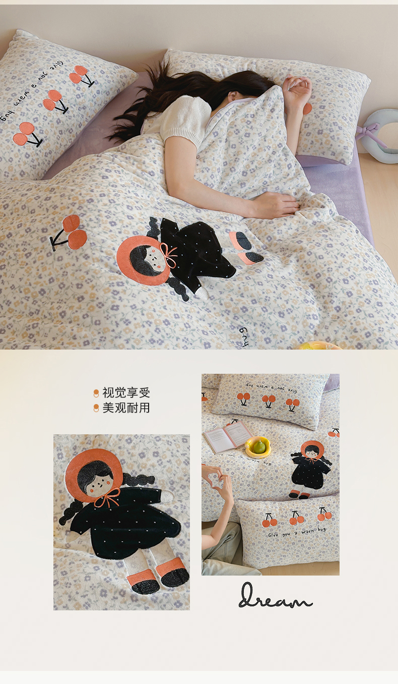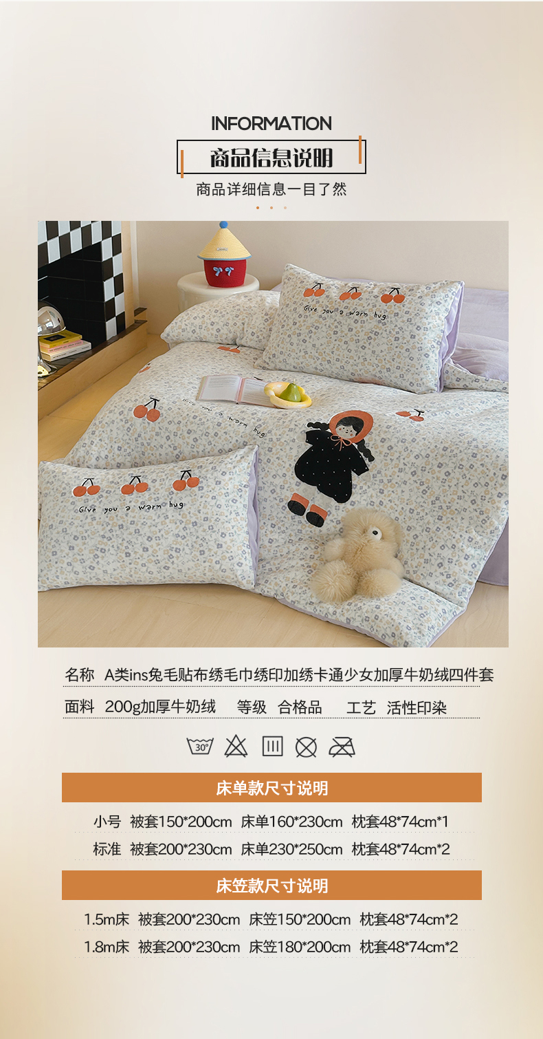 商品名称:桃子家居 2025新款A类ins兔毛贴布绣毛巾绣印加绣卡通少女加厚牛奶绒系列四件套 绒贴布绣-樱桃女孩