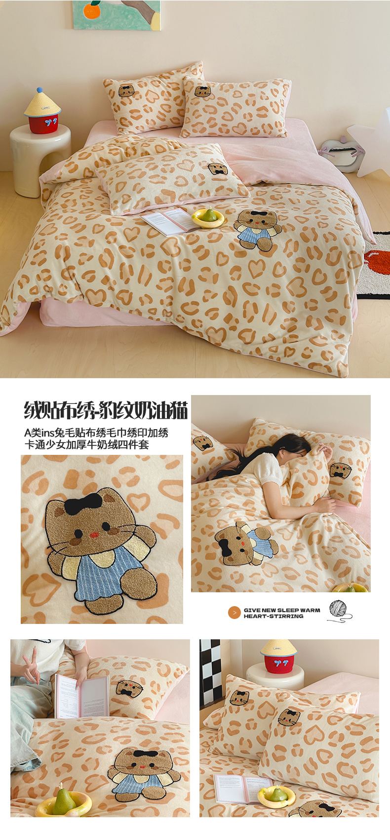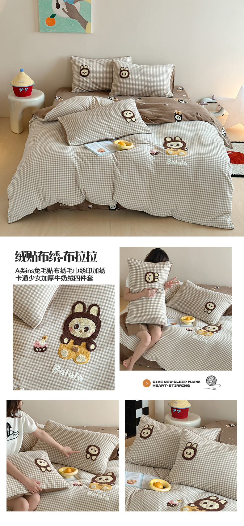 (总)桃子家居 2025新款A类高级仿生绵羊绒兔毛贴布绣刺绣工艺卡通少女加厚牛奶绒系列四件套,绵羊绒-冬日熊,绵羊绒-狗狗伙伴,绵羊绒-蓝条咖啡狗,绵羊绒-毛球猫咪,绵羊绒-圣诞小狗,绵羊绒-星星人